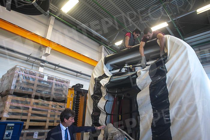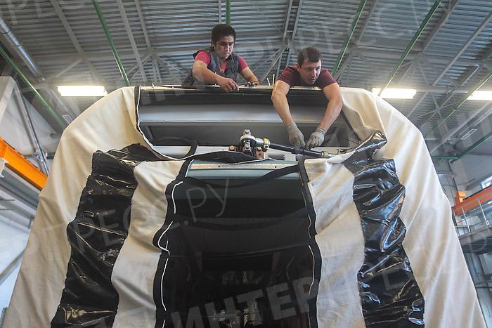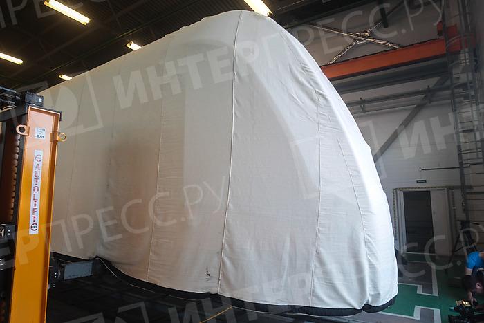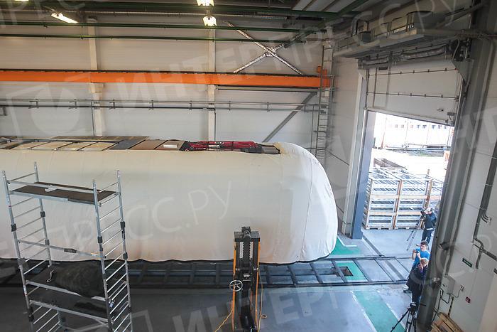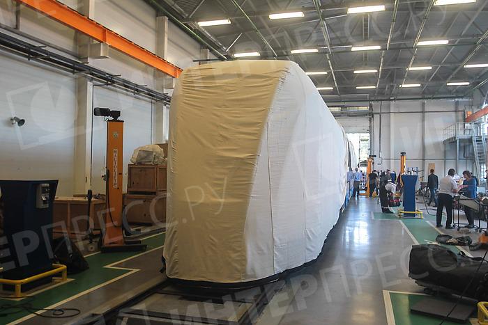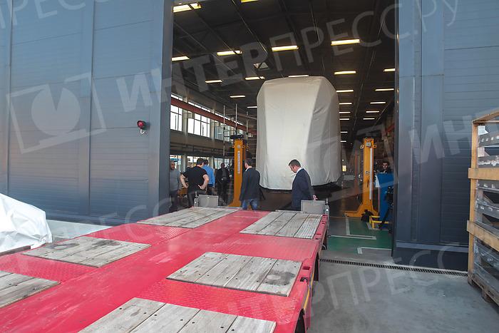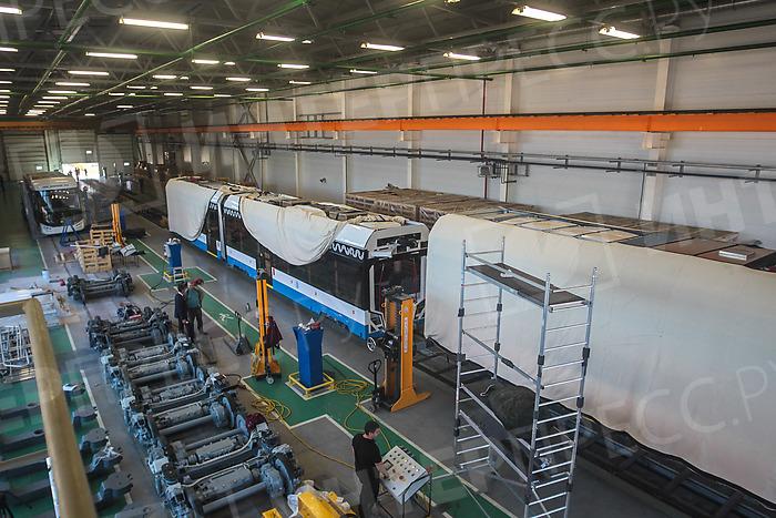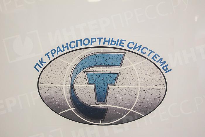 03-09-2018 Россия. Санкт-Петербург. Подготовка к отправке 34-метрового трамвая 71-934 "Лев" на территории производственной компании "Транспортные системы". Вывеска на здании сборочного корпуса электрического транспорта производственной компании "Транспортные системы". Фото: Роман Пименов