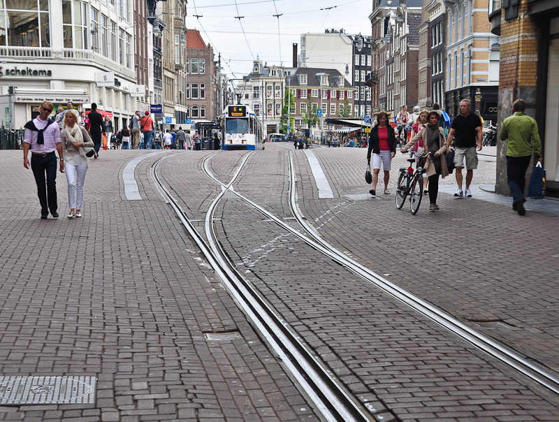 А мне в своё время в Амстердаме понравилось решение двустороннего движения по узким улицам.