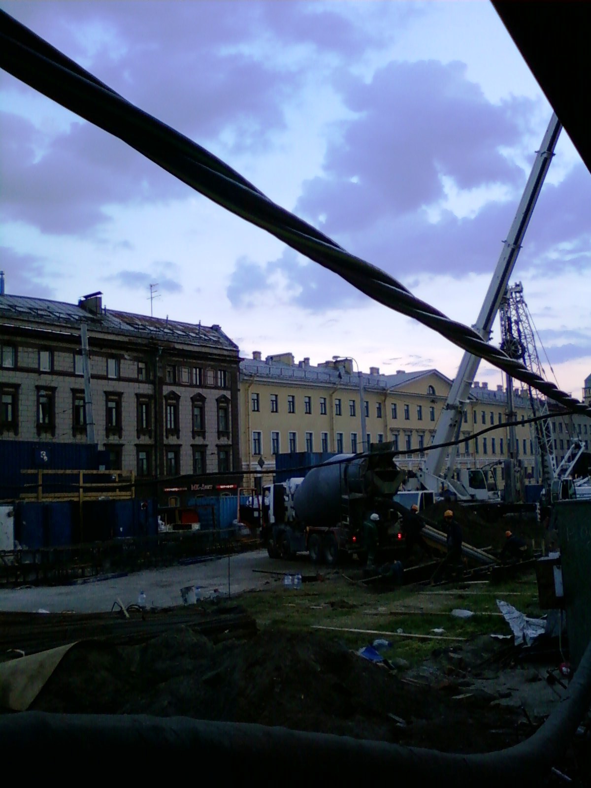 8 июля, воскресенье, 22.00. На стройплощадке на наб. Макарова вовсю кипит работа... (фотографии сделаны через отверстия в заборе).