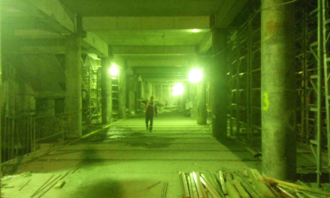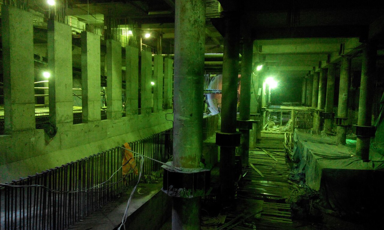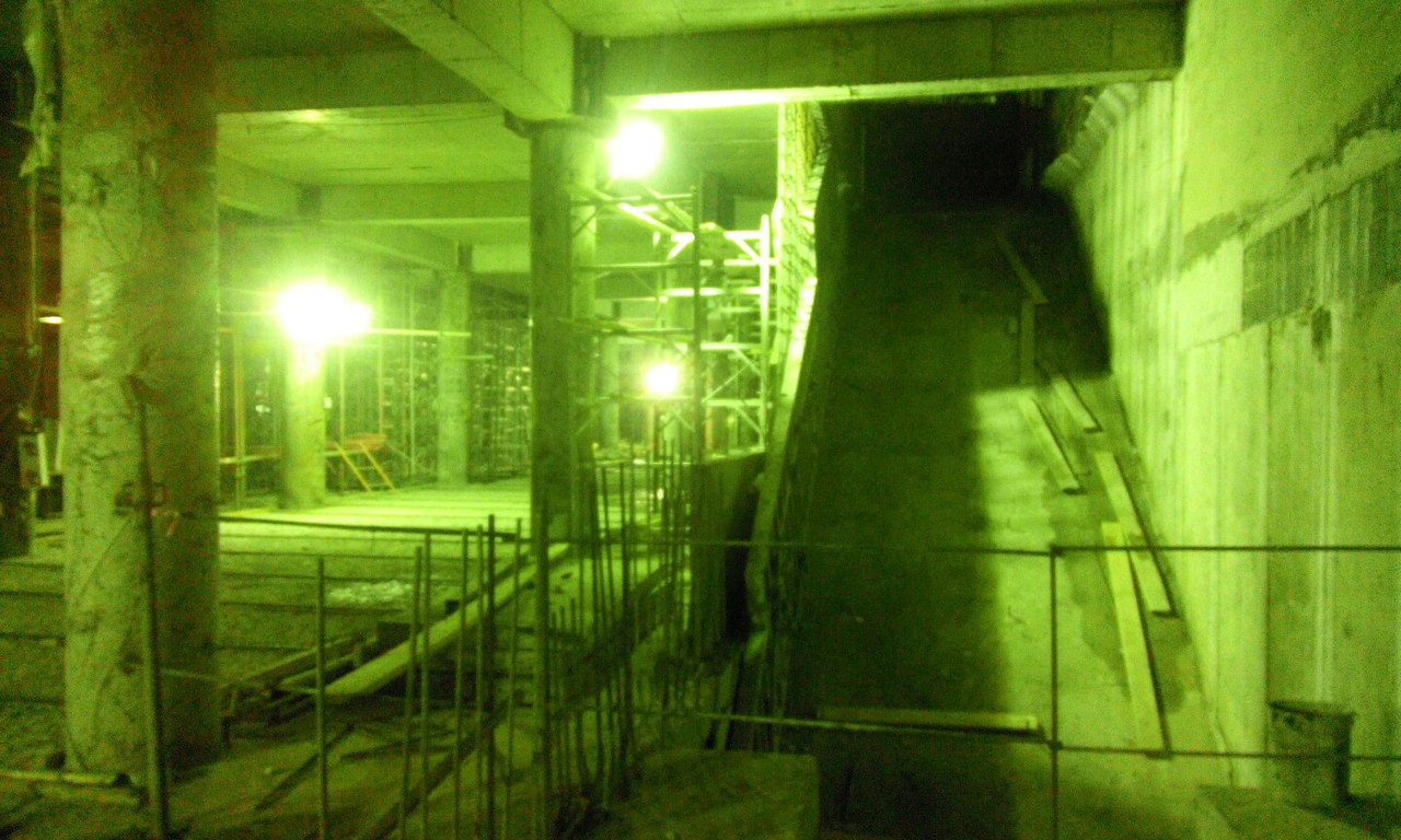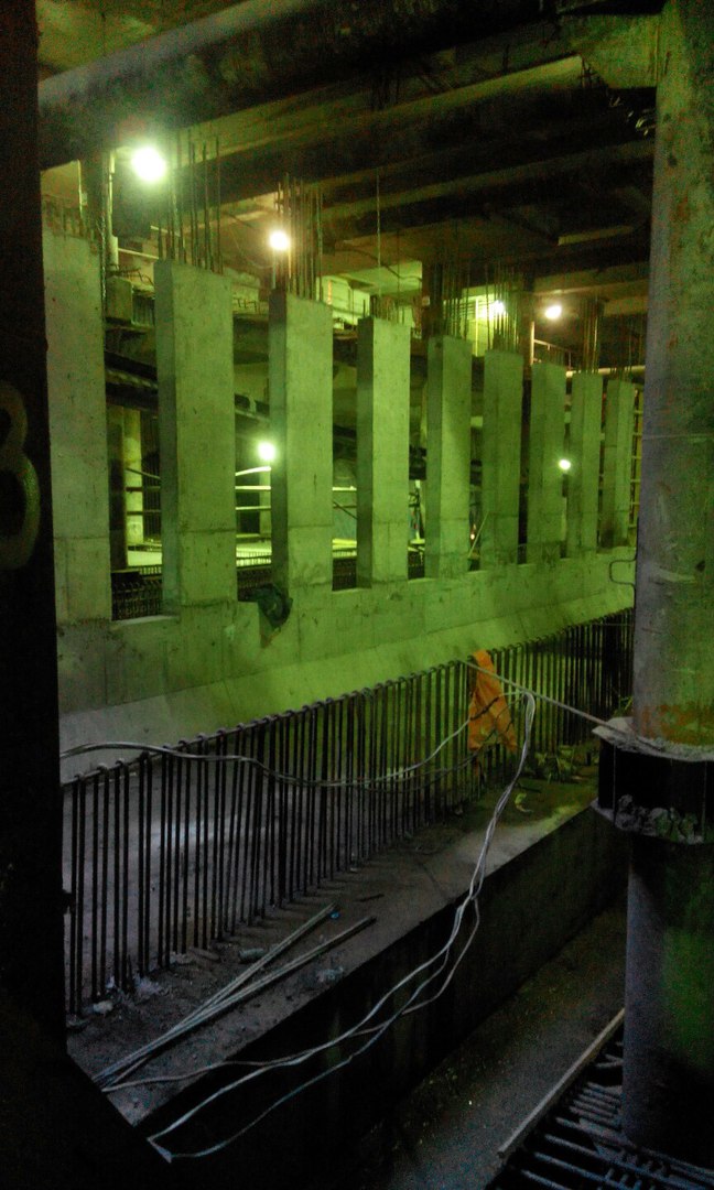 Немного свежих фото и информации о ходе строительства. На верхнем ярусе продолжаются отделочные работы, на полы укладывается гранит. Дело это хлопотное, требует много подготовительных работ. На среднем ярусе от северного торца и до переходного мостика залито перекрытие между осями В-Д (где стояли расстрелы), начинаются работы по сооружению внутренних конструкций служебных помещений. Бетонируются наклонные плиты под эскалаторы с северной стороны, так же забетонирован лестничный спуск с переходного мостика на платформу. Платформа залита от северного торца до 22 оси, междупутная стена с проемами - от северного торца до примерно 28 оси. Работы на нижнем ярусе от 22 оси (конца переходного мостика) и до южного торца по прежнему сильно отстают, грунт уже выбран, но плиты жесткого основания до сих пор не залиты с обоих сторон от путей. Отставание по прежнему вызвано проблемами с гидроизоляцией стен, течи химией никак не остановить, приходится все заваривать металлоизолом. Полагаю на гидроизоляцию этого участка уйдет еще не меньше месяца. Вчера начали демонтировать блоки обделки у южного торца внутри станции, которые ставили и подвешивали временно для того, чтоб щиту было от чего отталкиваться. А на поверхности между стройплощадкой и стадионом вовсю идут работы по благоустройству территории, прокладке канализации и коммуникаций. Работы ведет Водоканал. Вот такие дела