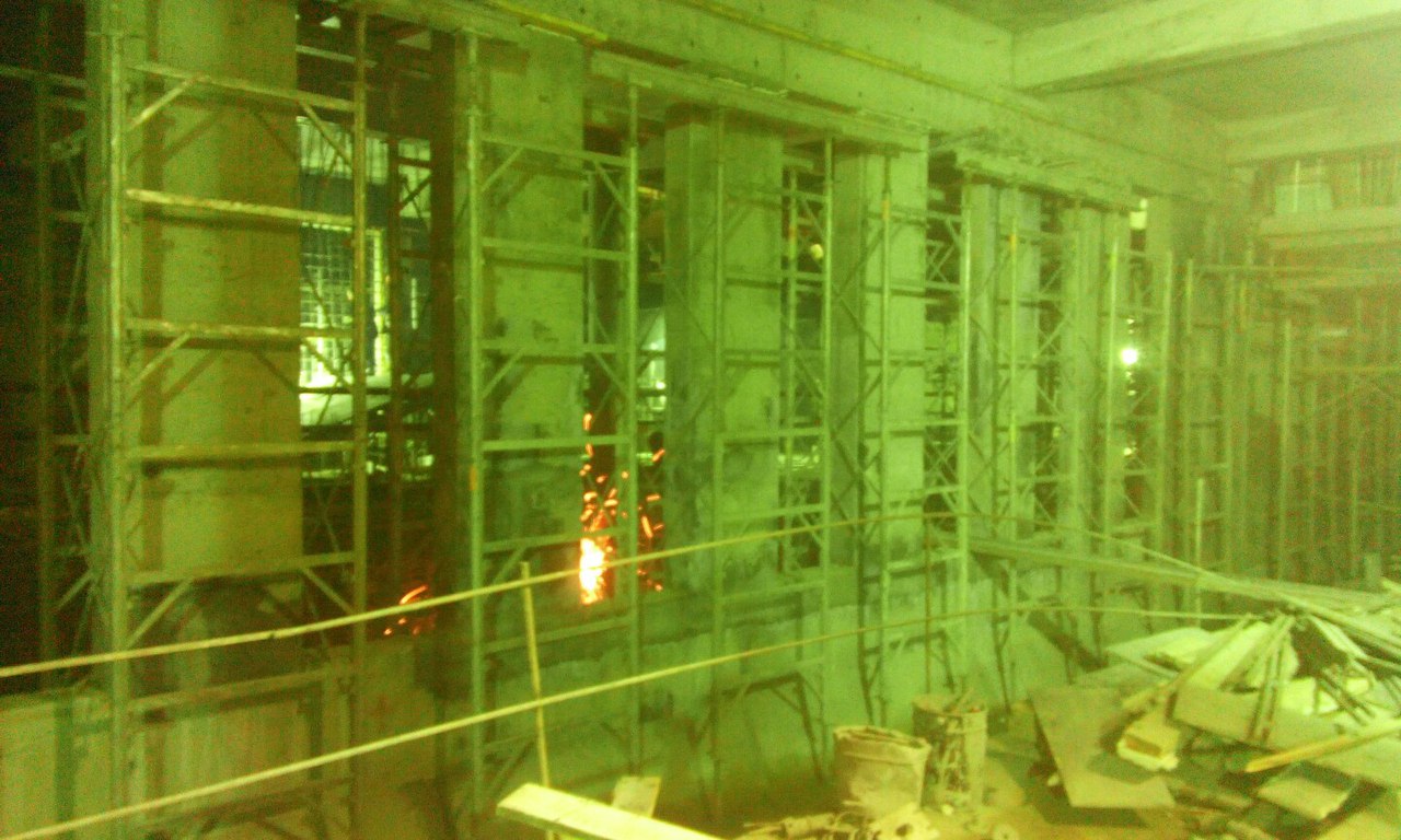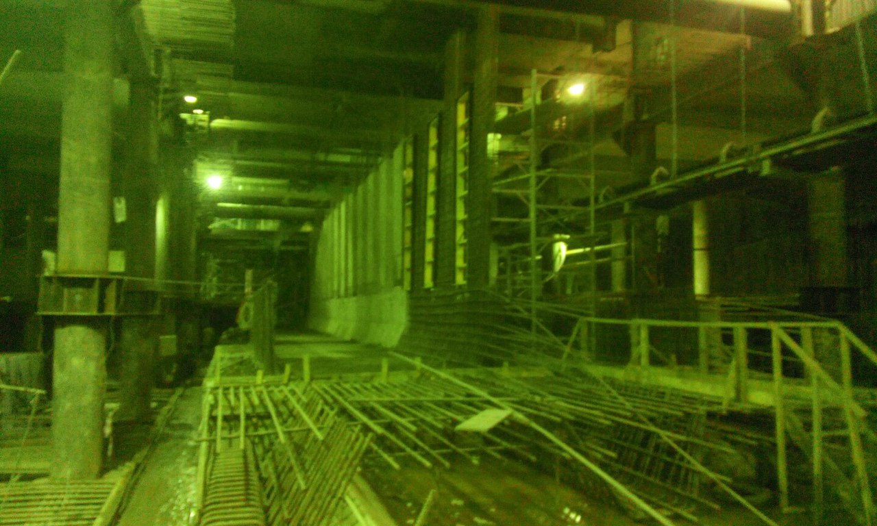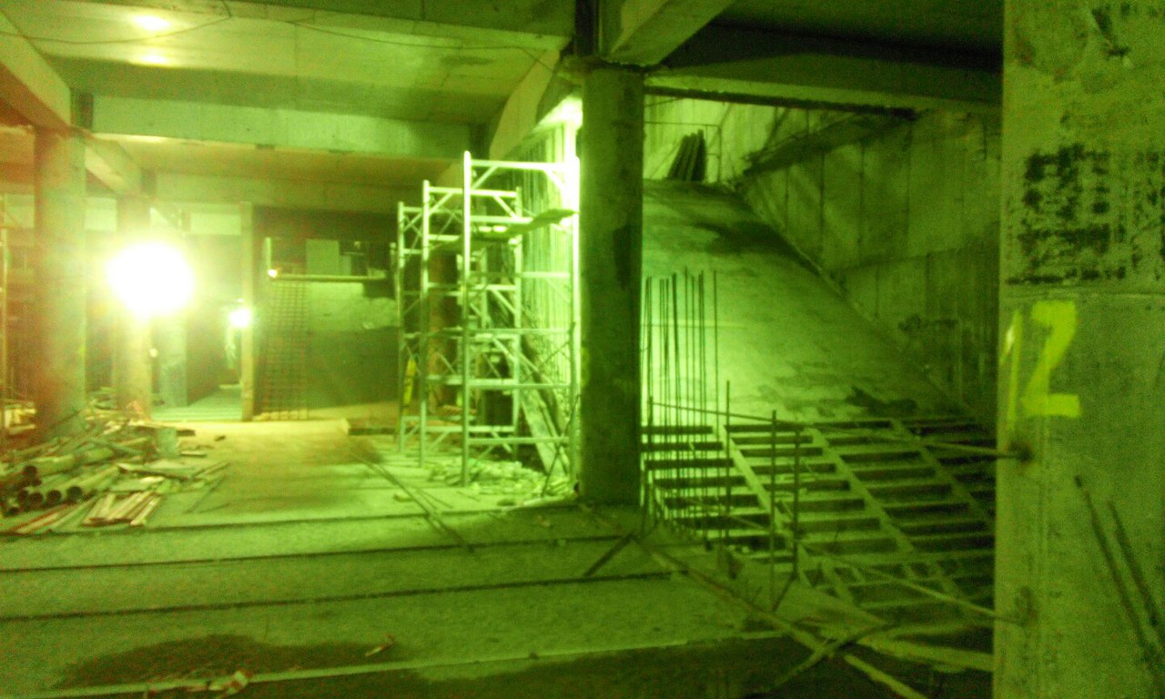 Немного свежих фото и информации о ходе строительства. На верхнем ярусе продолжаются отделочные работы, на полы укладывается гранит. Дело это хлопотное, требует много подготовительных работ. На среднем ярусе от северного торца и до переходного мостика залито перекрытие между осями В-Д (где стояли расстрелы), начинаются работы по сооружению внутренних конструкций служебных помещений. Бетонируются наклонные плиты под эскалаторы с северной стороны, так же забетонирован лестничный спуск с переходного мостика на платформу. Платформа залита от северного торца до 22 оси, междупутная стена с проемами - от северного торца до примерно 28 оси. Работы на нижнем ярусе от 22 оси (конца переходного мостика) и до южного торца по прежнему сильно отстают, грунт уже выбран, но плиты жесткого основания до сих пор не залиты с обоих сторон от путей. Отставание по прежнему вызвано проблемами с гидроизоляцией стен, течи химией никак не остановить, приходится все заваривать металлоизолом. Полагаю на гидроизоляцию этого участка уйдет еще не меньше месяца. Вчера начали демонтировать блоки обделки у южного торца внутри станции, которые ставили и подвешивали временно для того, чтоб щиту было от чего отталкиваться. А на поверхности между стройплощадкой и стадионом вовсю идут работы по благоустройству территории, прокладке канализации и коммуникаций. Работы ведет Водоканал. Вот такие дела