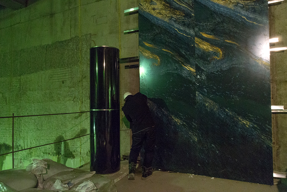 Так же в вестибюле вовсю идет укладка гранита на пол. Гранит будет трех цветов, светло-серый, темно-серый и черный. Уже облицовано на вскидку примерно треть всего пространства пассажирской зоны вестибюля.