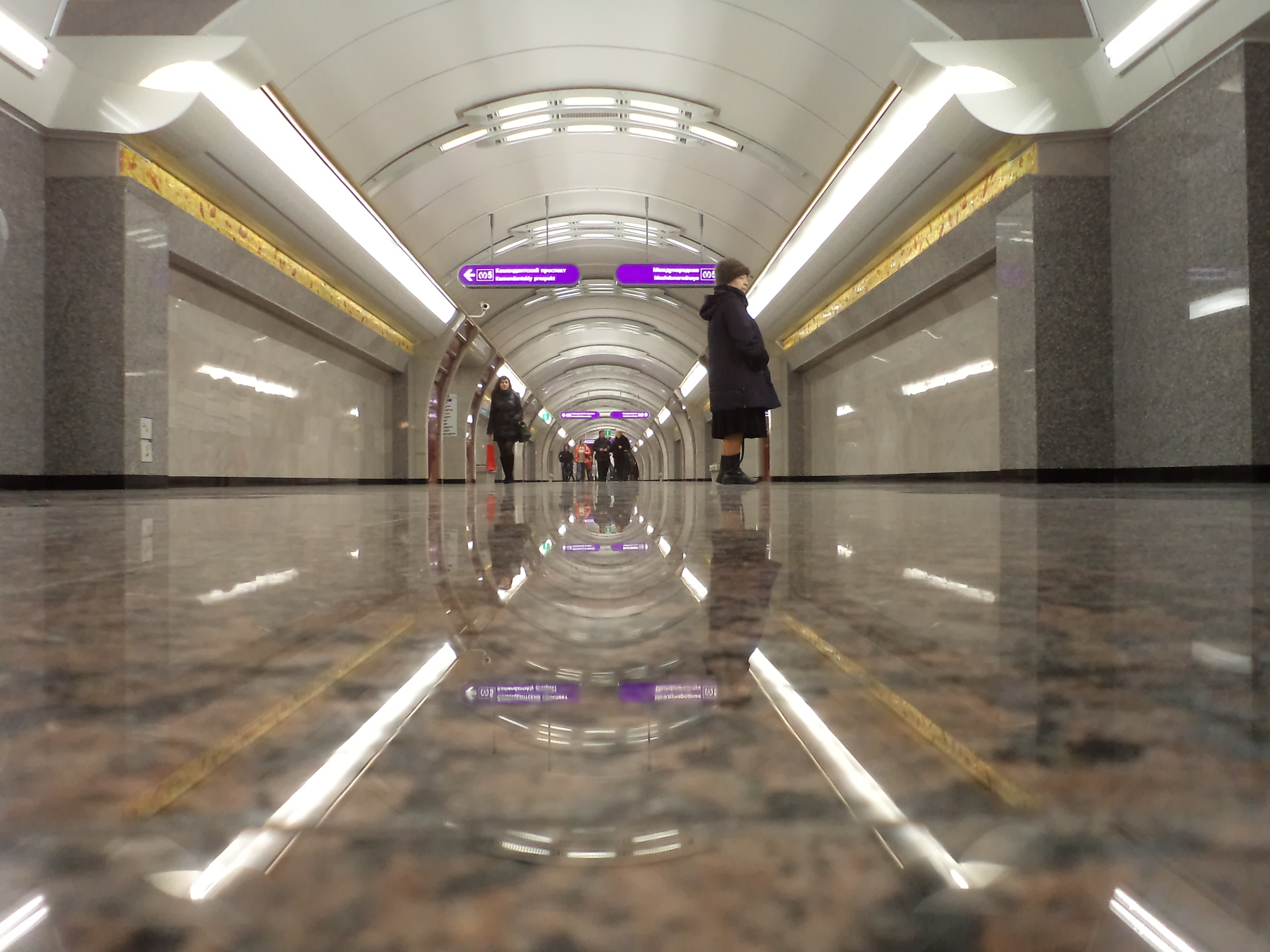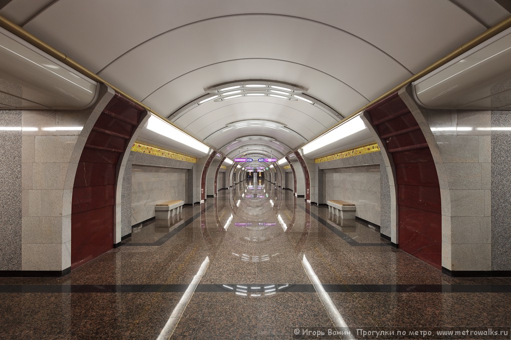 Панно в торце зала, очень удачный цвет камня, которым "ступенчато" облицованы пилоны, интересная облицовка дверей на путевых стенах, а также светильники в ЦЗ, сгруппированные почти как на "Кировском Заводе". Еще очень понравилось, что проходов между пилонами больше, чем на "Обводном Канале": явно нацеливались на большой пассажиропоток (которого пока что нет). Ну и довольно яркое освещение. А также "аэрокосмические", отличные от привычных, объемы центрального зала, уже однажды опробованные на "Обводном Канале" - беспроигрышный вариант для пилонника XXI века. А, еще дежурная по станции понравилась :crazy:
