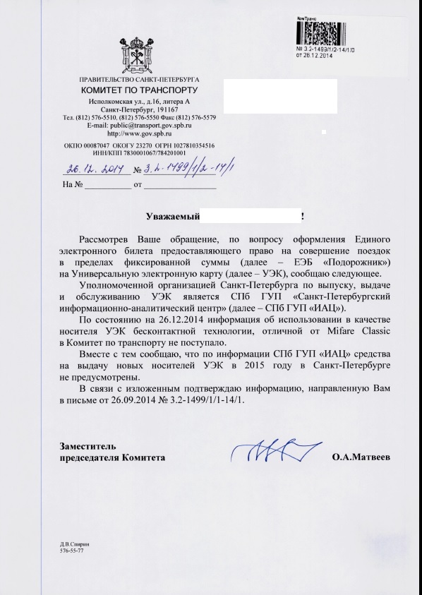 Вот и пришел ответ из Комитета по транспорту. Видно надо снова писать в правительство РФ и просить что бы они написали в комитет по транспорту, что в Mifare Classic на УЭК нет уязвимости. Только это еще на 2-3 месяца затянется