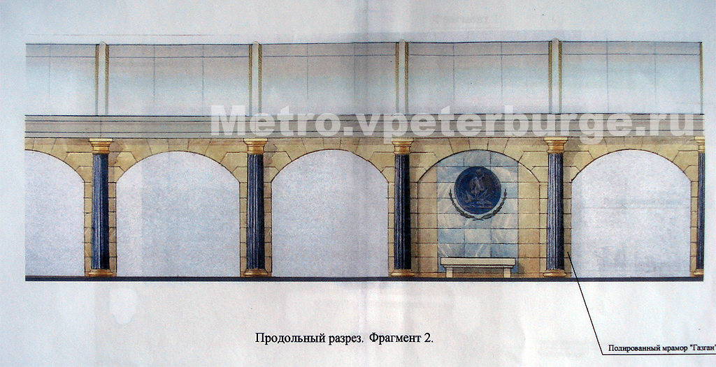 По какой-то причине никто за многие годы ни разу не поинтересовался тем фактом, что пропорции центрального зала на этом эскизе заметное отличаются от фактических на станции. Такая ширина даже у более просторной Звенигородской не имеется. Или здесь имеют место быть арки пониженной высоты и фальшпотолок по аналогии с Технологическим институтом? Тоже маловероятно…