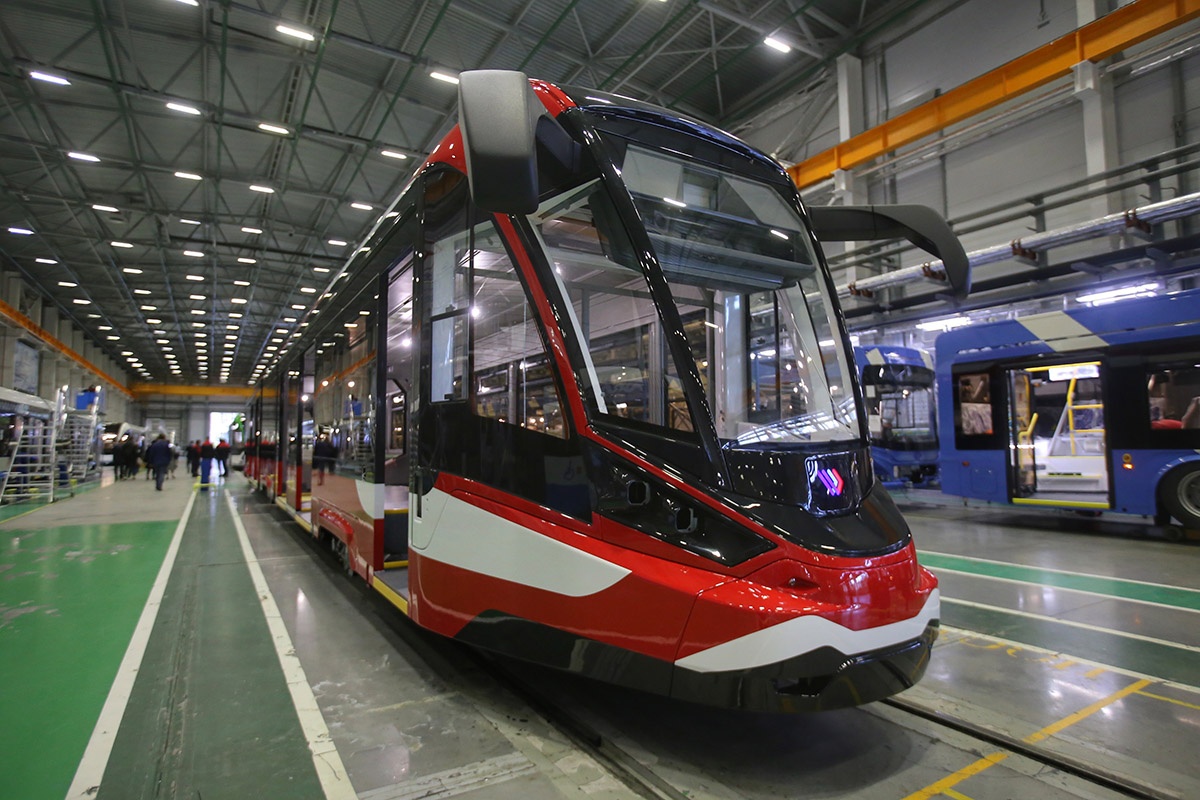 И все же главным гвоздем программы был первый в России трехсекционный трамвай с полностью алюминиевым корпусом — «Витязь-Ленинград». Собственно, сборочные компоненты производятся в Твери, где под это дело переоборудовали площадку, а конечная сборка и обкатка — в Петербурге. Все, что предписывает транспортная мода, на месте: широкий проход, медиакомплексы, USB-разъемы для зарядки телефонов, Wi-Fi, специальные элементы для поглощения вибрации во время движения, подогрев входной зоны. «На три тонны легче [по сравнению со стальным], — рассказывал соучредитель ПК ТС Феликс Винокур губернатору. — Износ пути меньше. Это правильная история. Посмотрите, какое у него красивое личико».
