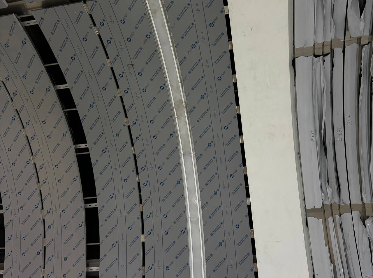 Со стороны улицы Васи Алексеева идёт монтаж архитектурных элементов из стеклофибробетона песочного цвета на антаблемент. Также продолжается монтаж элементов тёмно-серого цвета на колонны. Параллельно ведётся установка витражного профиля в будущих коммерческих помещениях.