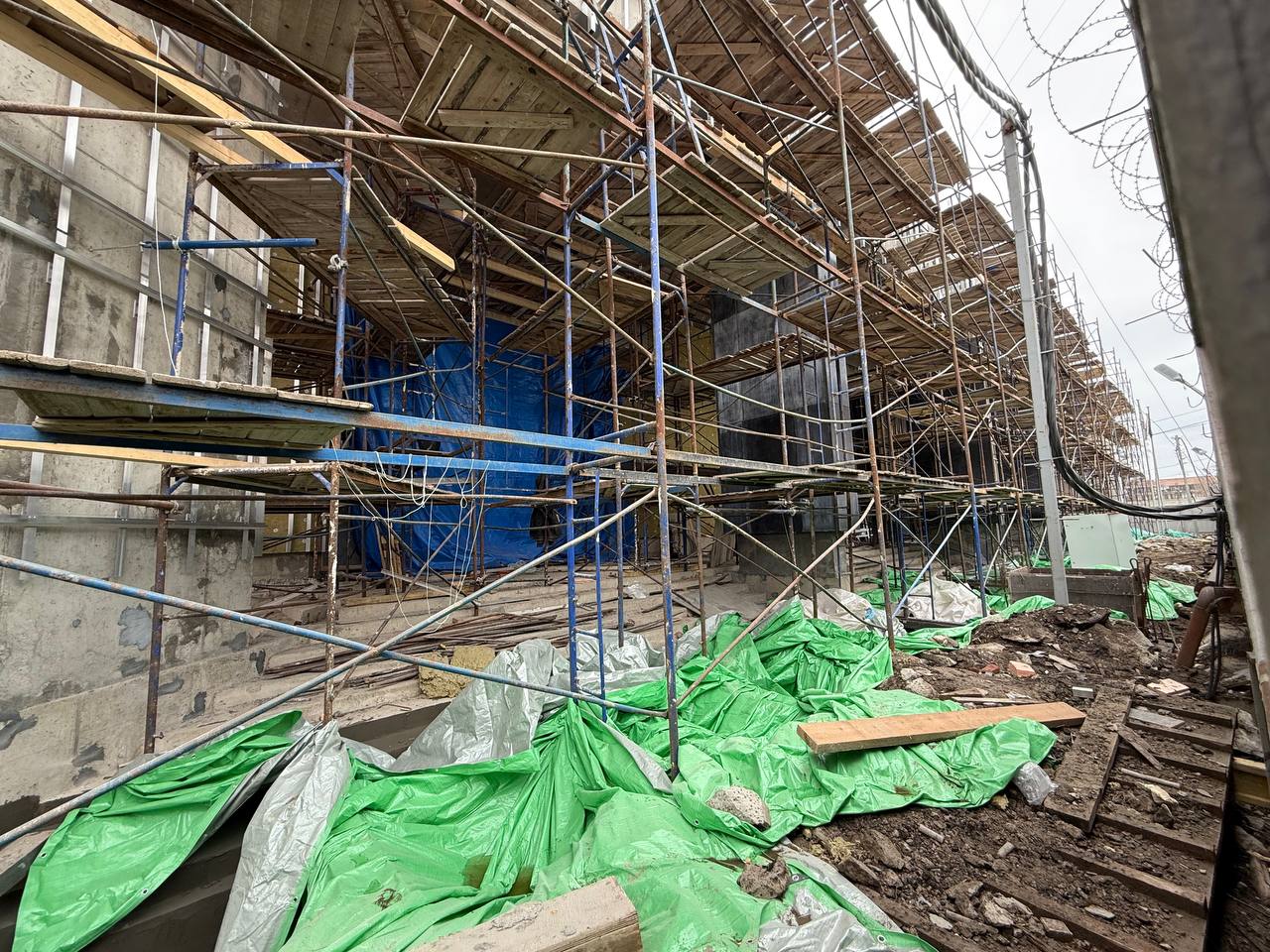 Все монолитные работы с вестибюлем завершены, перекрытия готовы. Идет установка вентилируемого фасада по периметру здания. Строители приступили к облицовке некоторых колонн, и сейчас уже можно представить, как будет выглядеть входная группа.