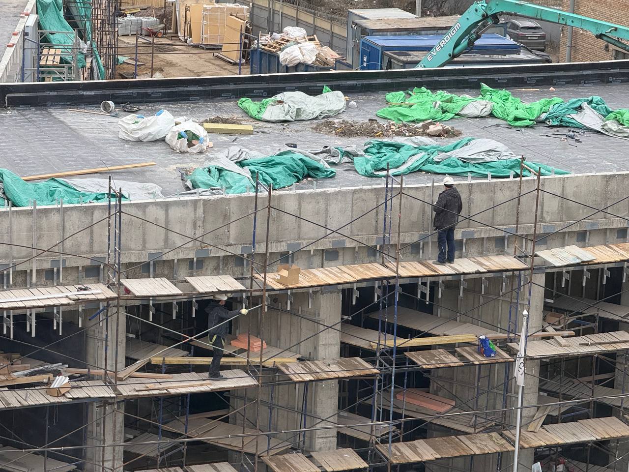 Завершаются работы по устройству гидроизоляции кровли здания.