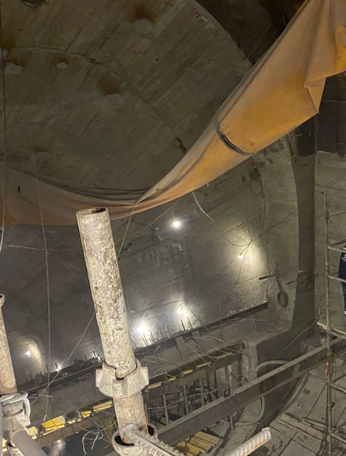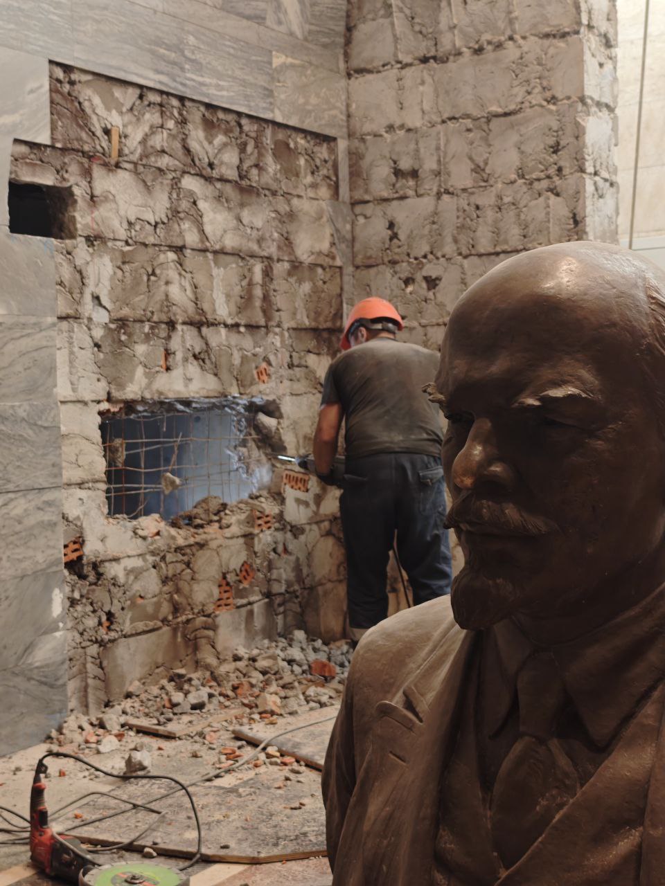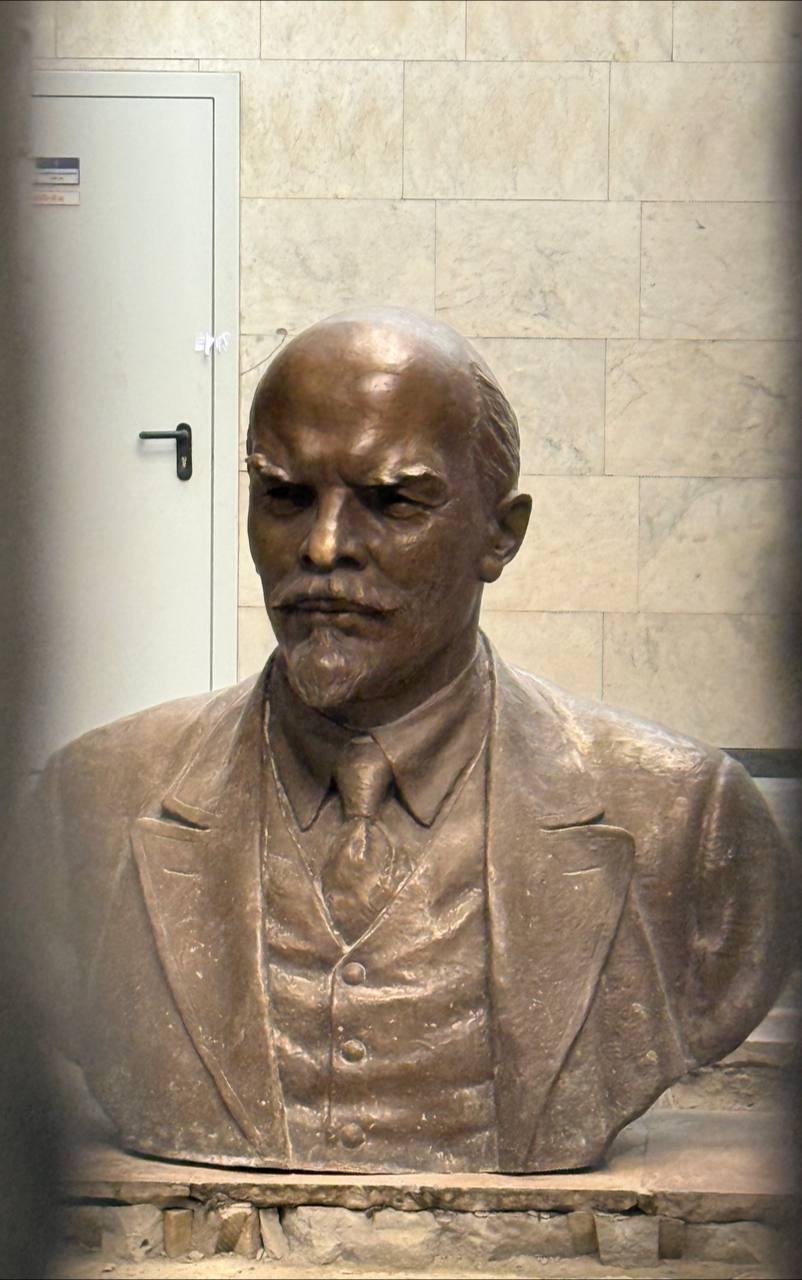 Бюст В.И. Ленина демонтирован, а на самой станции Кировский завод начинаются работы по армированию опор лестницы перехода.