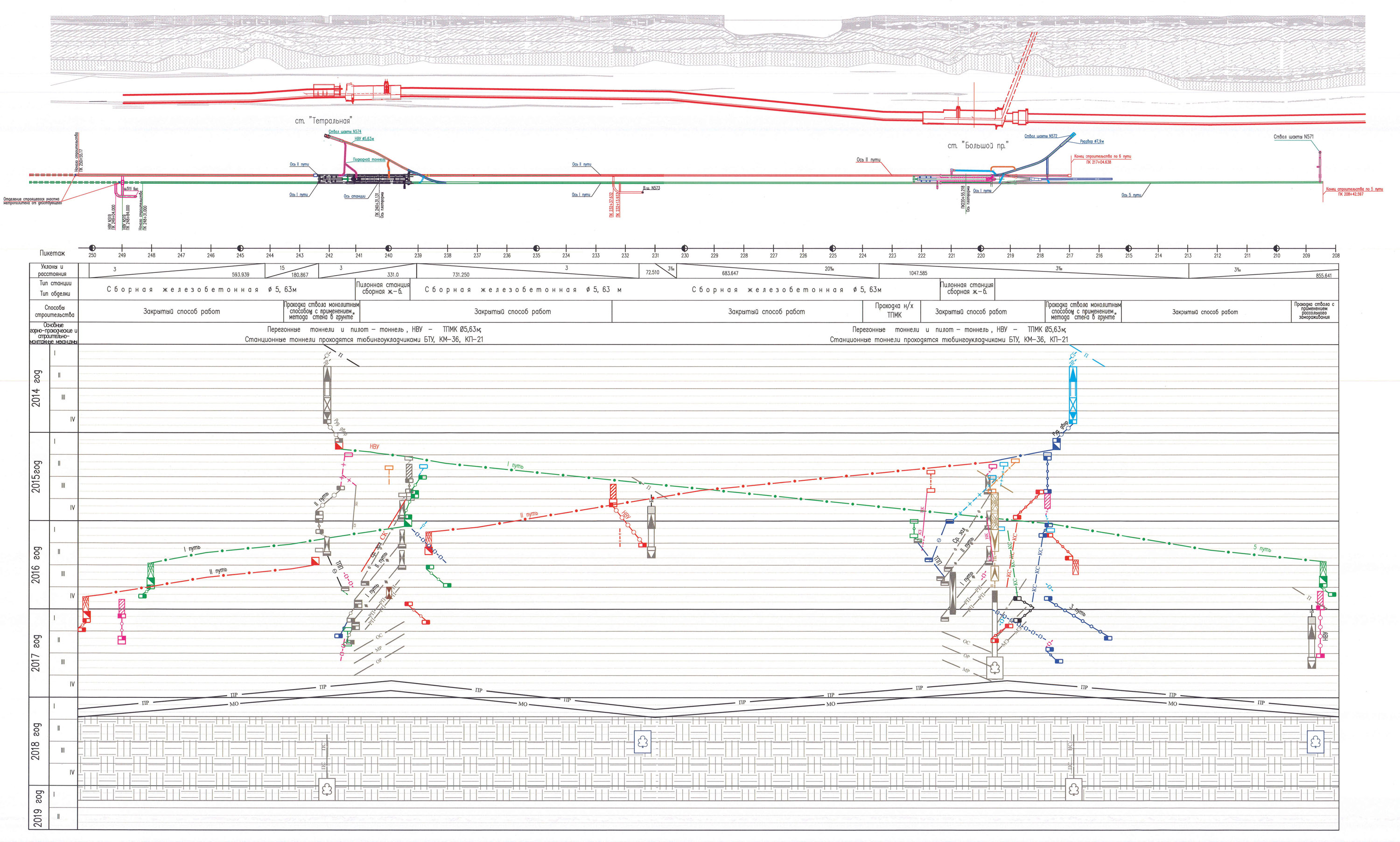 Как бы то ни было, на сегодняшний день мы построили часть околоствольных выработок, систему ходков для будущих фильтровентиляционных установок, прошли хороший кусок венттонеля и вручную построили камеру на пересечении этого венттонеля с перегонным тоннелем второго пути. Открывается возможность строить тупиковые тоннели за станцией. С правой стороны станционного комплекса пройден ходок к ТПП, пошла проходка самой ТПП. С противоположной стороны станции тоже пройден подходной ходок, разработан грунт и смонтированы первые кольца ТПП. Одним словом, мы приступили к проходке среднего станционного тоннеля!