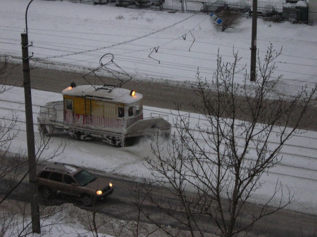 Самое смешное - сперва проехалась снегоуборочная техника по дороге, расчистила её более-менее, потом проехался трамвай и засыпал дорогу снова!