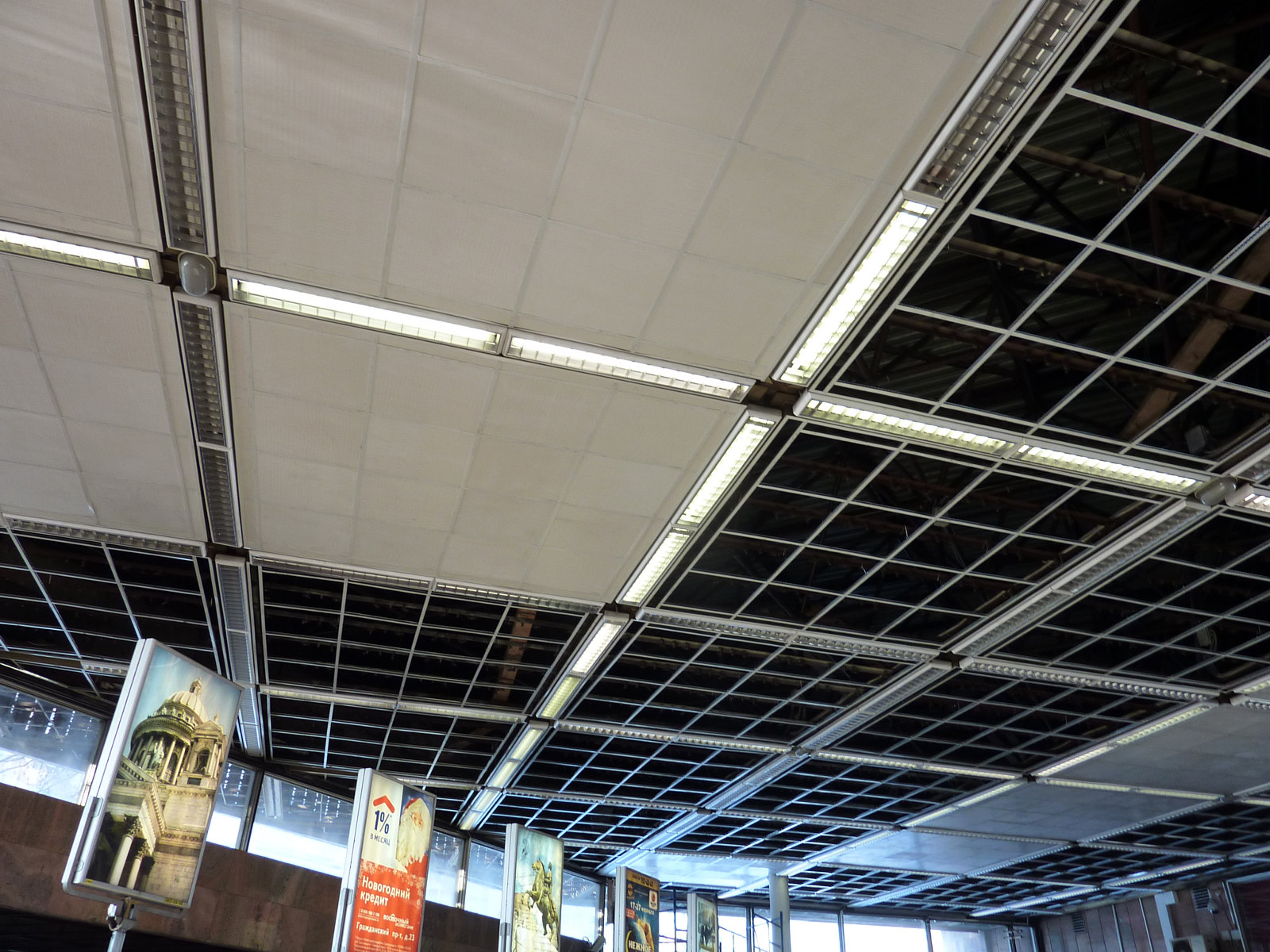 Позавчера сделал фото потолка. Прошу прощения за качество-всё делалось на бегу... Часть решёток под плиты разбирают. Видимо, планируется изменить конструкцию.