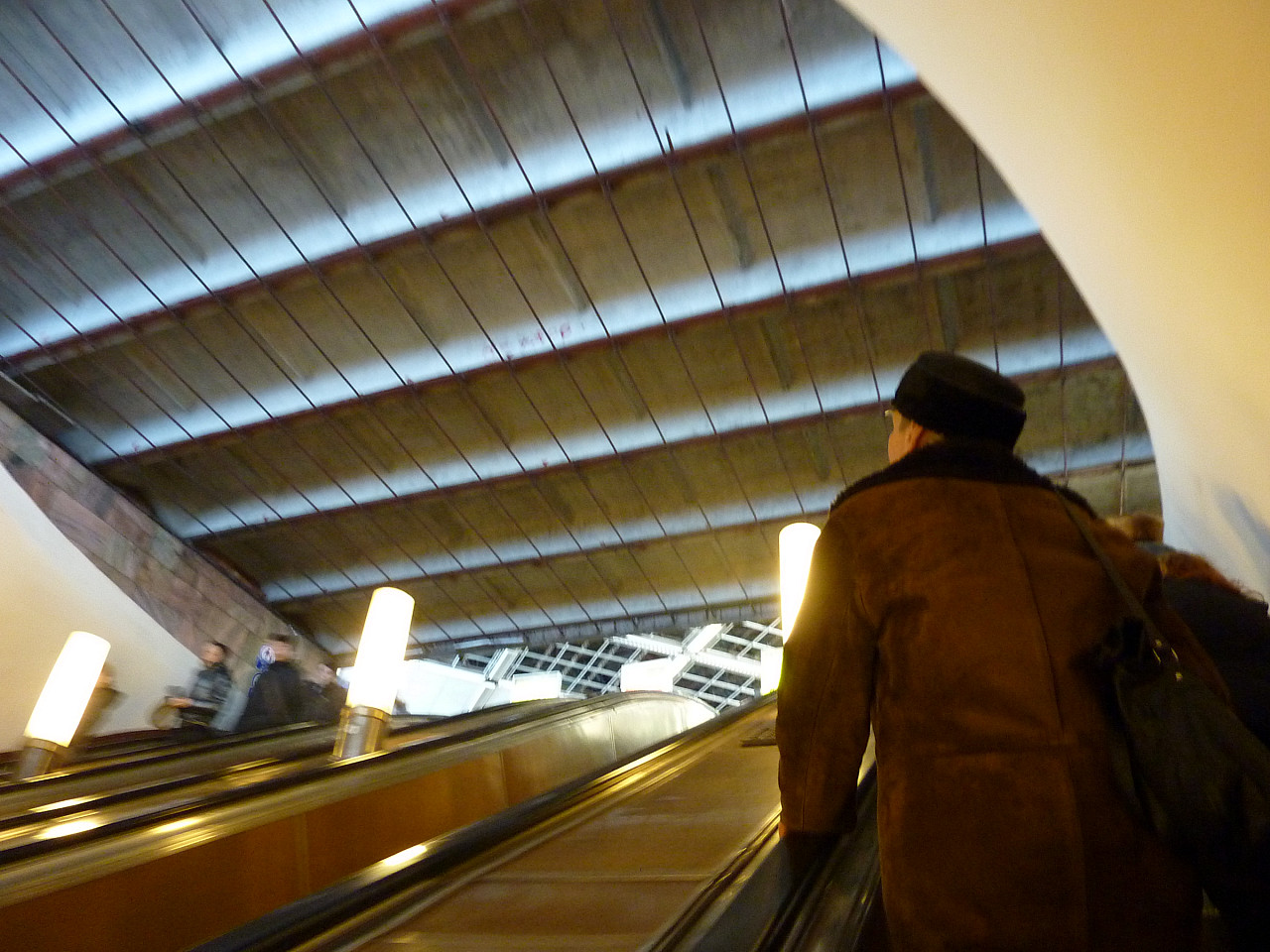 Вот так и другие (И какие ещё встроенные лампы? Насколько я понимаю, освещение в вестибюле заметили несколькими годами ранее - но тут претензий особых нет). Старые плиты были, насколько я помню, перфорированные, из лёгкого металла. А эти - самые обычные, офисные. То есть, тут мы имеем ситуацию, немного похожую по цвету на ремонт стен на "Политехнической". :) Но, их извиняет тот факт, что подобных плиток, кои были подвешены к потолку 40 лет назад, теперь днём с огнём не сыскать.