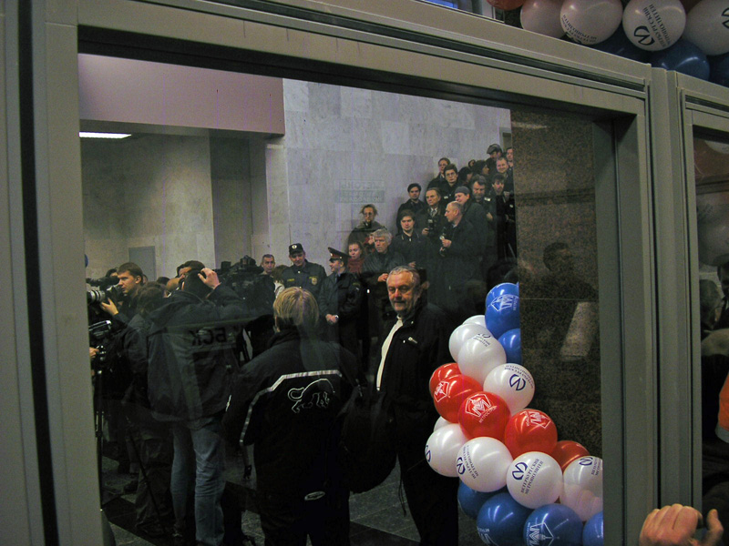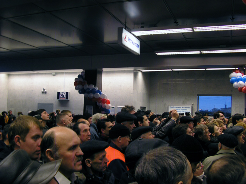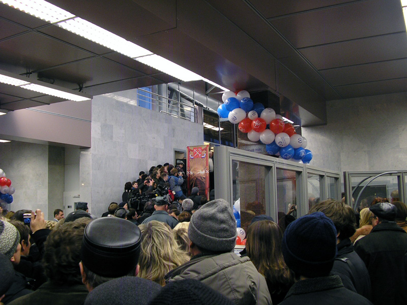 В районе 11-30 прошел в вестибюль, первая моя цель была кассы, которые еще не работали, однако не большая очередь уже была, к 12 часам очередь так и не выросла. В где-то 11-50 приехала Матвиенко и др., после перерезания ленточки в вестибюле стал творится бардак, у касс образовалось давка, ни о какой очереди в кассы речи уже не шло, все пытались прорватся к кассам первыми, однако я приобрел один юбилейный жетон за 12 рублей и несколько за 98, дальше была проблема вылезти из этой толпы не потеряв жетоны.