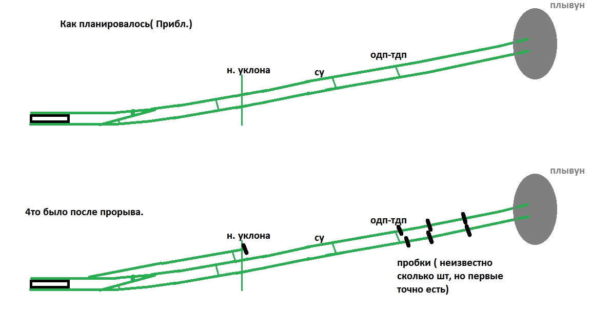 Ещё пофлужу, но съезд с "Первого"пути" на "Второй" не напоминает Ваську( Оборотный тоннель)? А правый мог не использоватся и через него велось строительство линии на поверхность он скорее всего первый и попал в плывун.там как раз шахта 410 с подходняком.