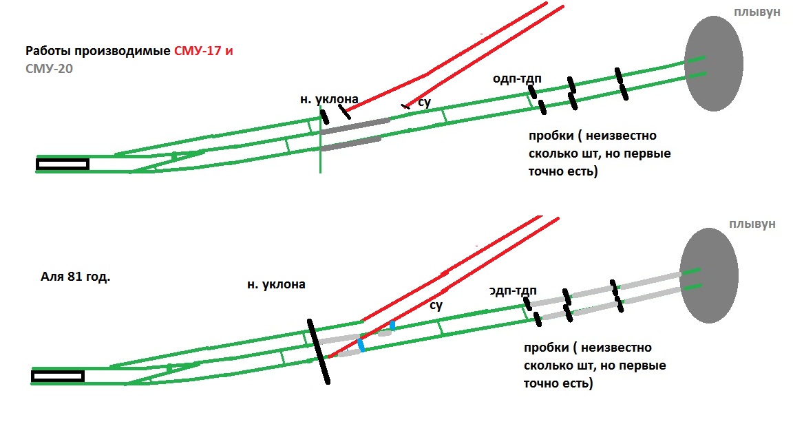 Попробую объяснить ещё раз про левый тупик. Как я считаю на момент пуска он мог быть на всю длину до Демонтажки. Но строительство его скорее всего было не запланиравано. Я уверен что чугунные тупики(правый и средний на данный момент) проходили где-то в 67-68 г.г и между ними был оборотный тоннель. И правый тоннель проходился первее. Потому что разница где в правом начинается чугун, а где в среднем велика т.е. они догоняли.Потом попали в плывун. Тоннели закрыли пробками и стали делать тюбинговый левый тупик с перспективой на вывод линии влево,а ЛТ сделать тупиком на ночной отстой составов(Нынешний средний). Допустим что он был такой длинный при сдаче. Но почему тогда линию ввели от Лс, а потом начали вести его к нему.( Слова про бетон у Ветерана). Т.е. левый тоннель от Пролёта,врезали в правый от Ломо. Это кэп. Подготавливал для врезки СМУ-20, Врезали СМУ-17. Вместе отсекали чгунные тоннели потом. Причем СМУ-20 сразо отсекло средний до границы СУ.А правый забетонировало часть чтоб врезать или перебрать. Затем после всего этого СМУ 17 уехало на правобережную, СМУ-20 в Рыбацкое. А СМУ-13 дальше проходить к Рб. В Лс закинь плиз.