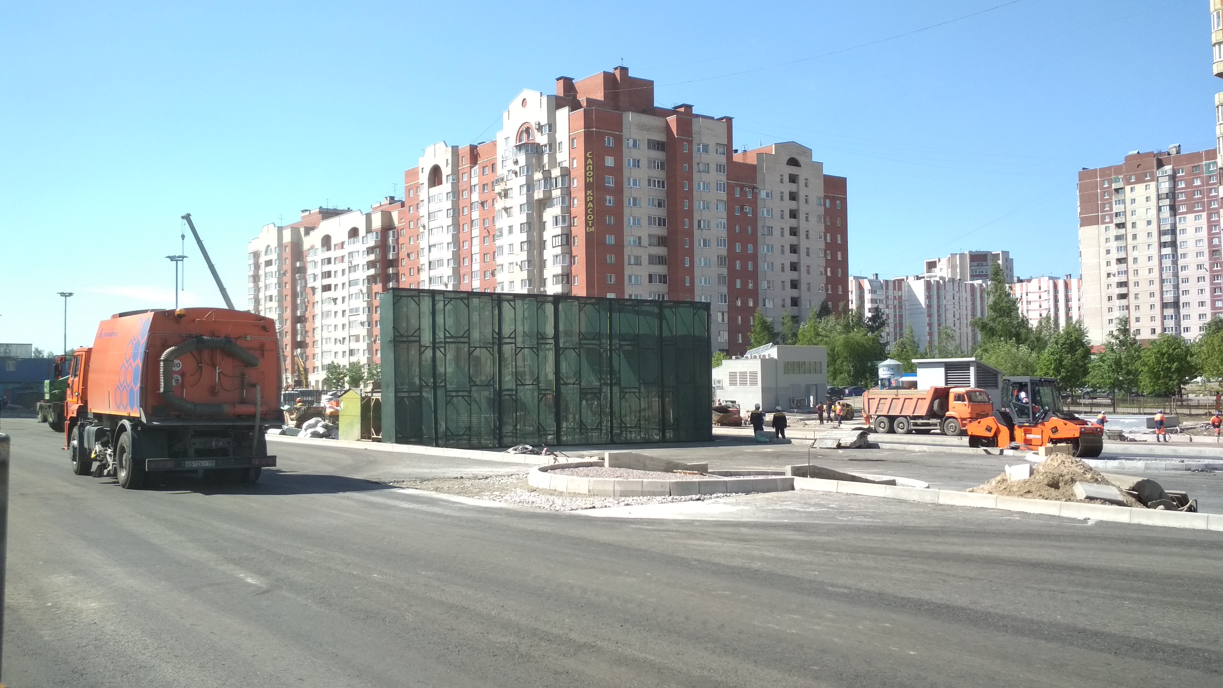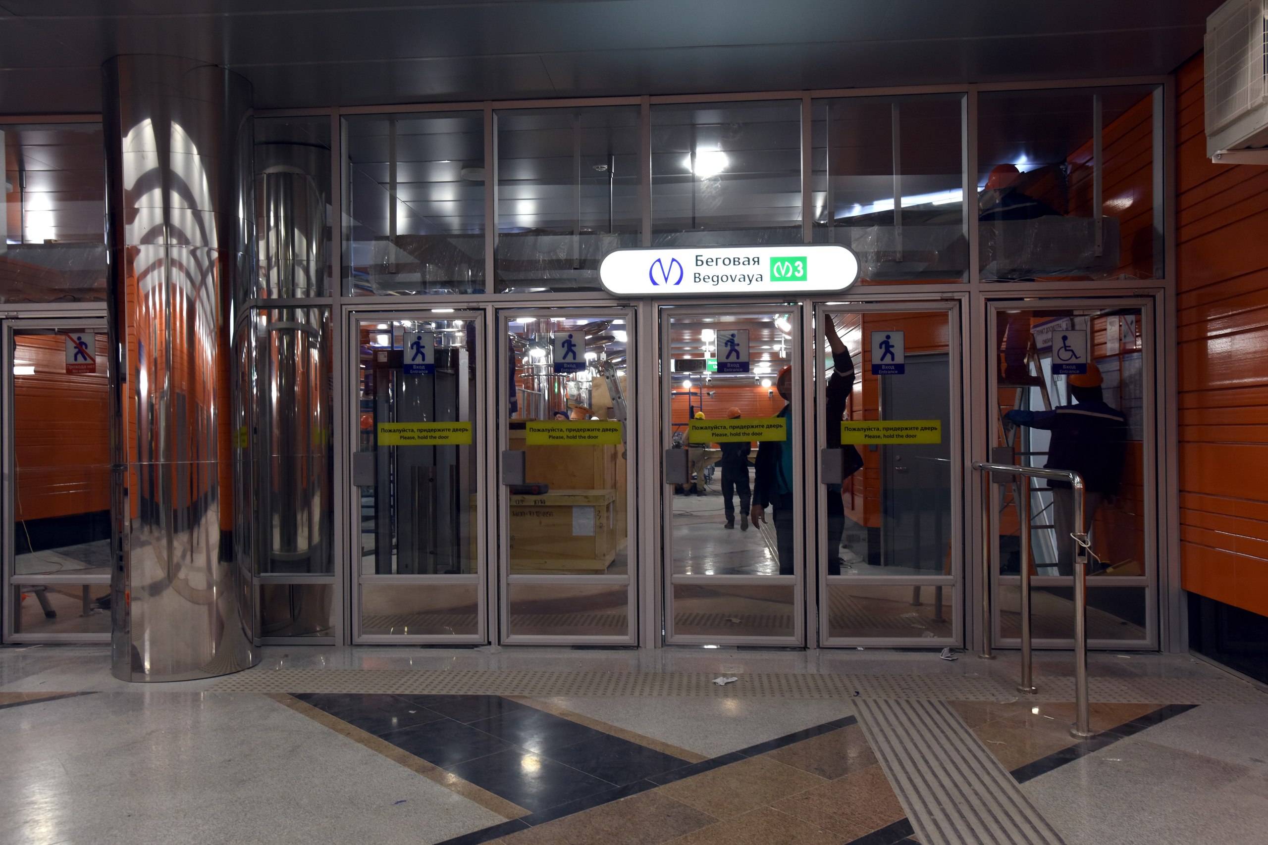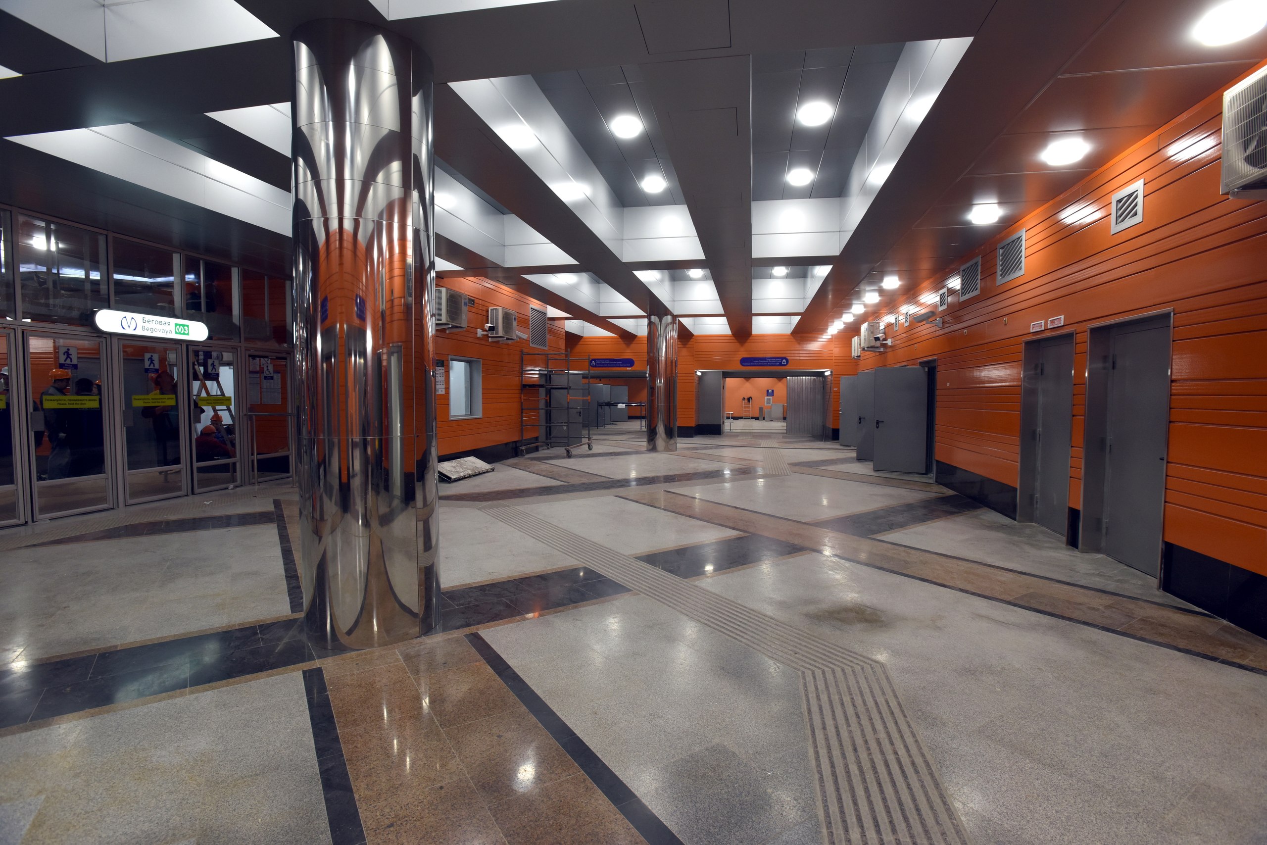 В Павильонах установлены рамки на вход (на мой взгляд совсем близко к дверям, хотя проектировщикам наверное виднее, с точки зрения удобства пассажиров и эргономики :roll:) , местами развешены камеры и информационные таблички. Катушки с кабелями кочуют из угла в угол по площадке, асфальтовые поля растут.