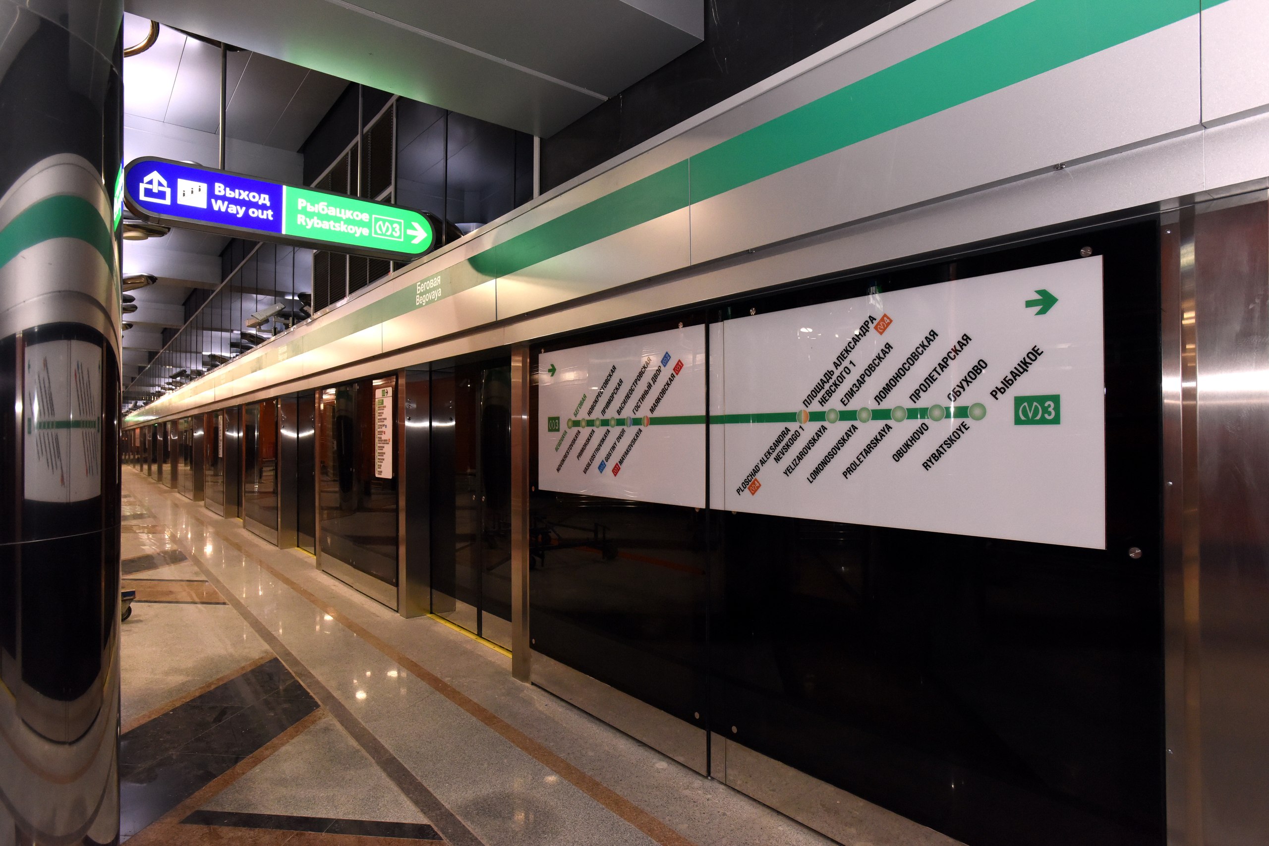 НИП, конечно, ожидаемо по-идиотски адаптировали к новому типу станции, зачем нужна зеленая полоса с названием станции над дверями, если ее из вагона не видно, зачем клеить схему линии на стекло, если её можно было разместить там, где сейчас как раз зеленая полоса, а лучше вообще убрать, достаточно указателей со списком станций перед спусками на платформу.