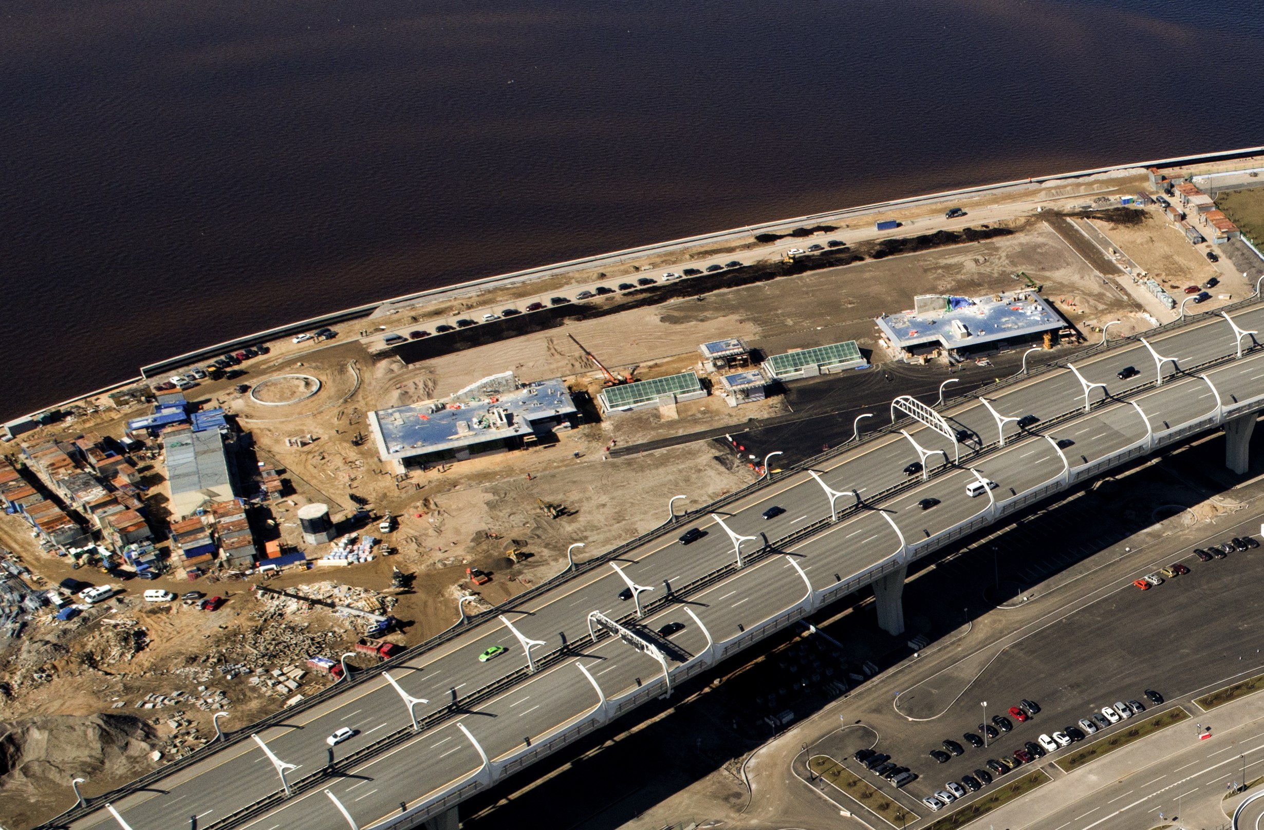 Пункты досмотра стадиона сделаны по всему периметру. С западной стороны они меньше и интегрированы в парковки. Именно эти пункты решено не открывать для простых смертных. В основном это связано с существующей схемой доступа транспорта на территорию стадиона. Транспорт досматривают на КПП, расположенном на Южной дороге (виден в правом углу фото с мостом). Таким образом, необходимо направить потоки людей к восточным пунктам досмотра, при этом пересечь Южную дорогу с уже досмотренным транспортом. Для этого и придумали мост.