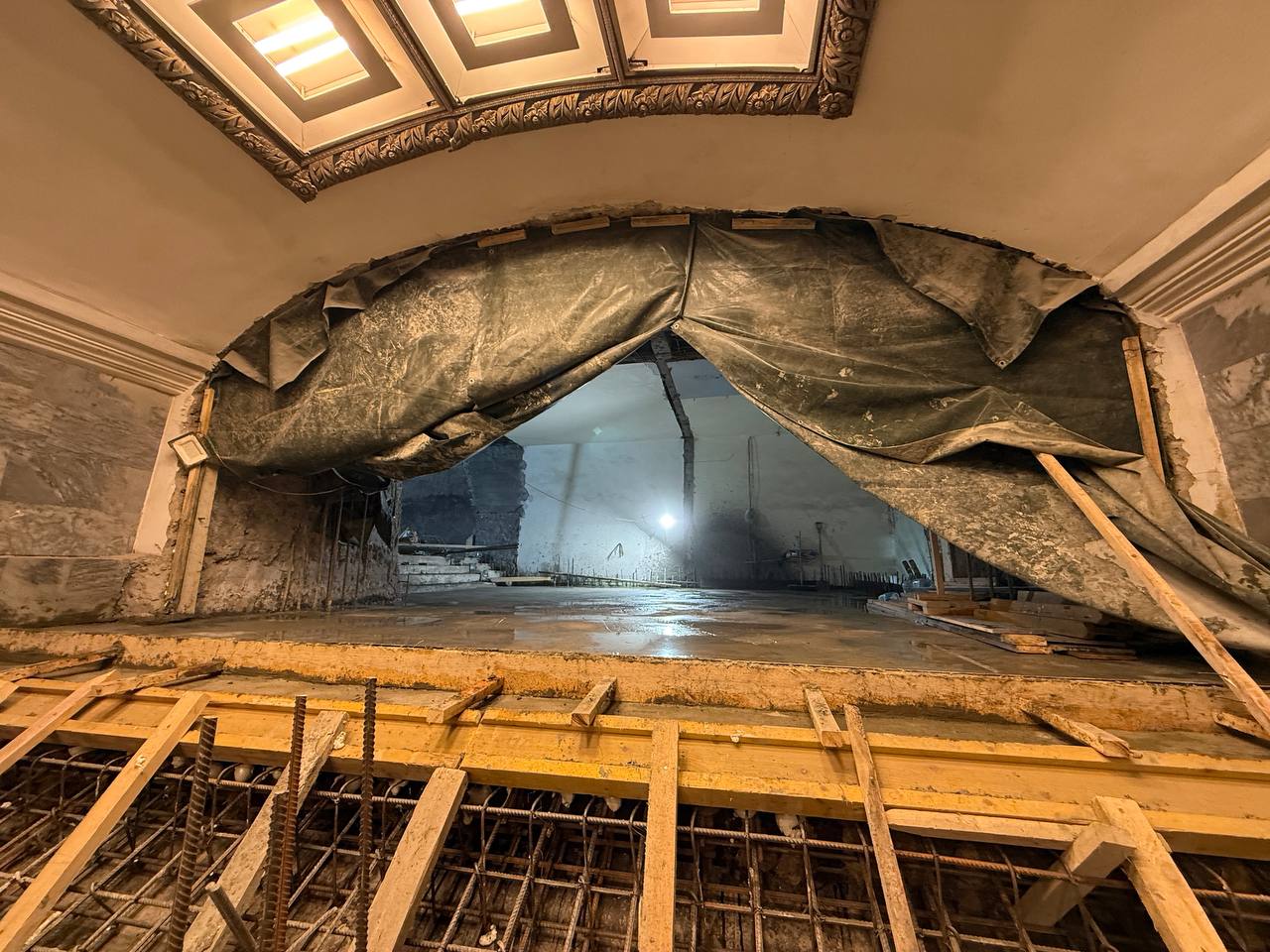 Чтобы разломать торцевую стену поперечной камеры и соединить пересадочный узел со станцией "Кировский завод" внутри камеры прежде была забетонирована новая стена.