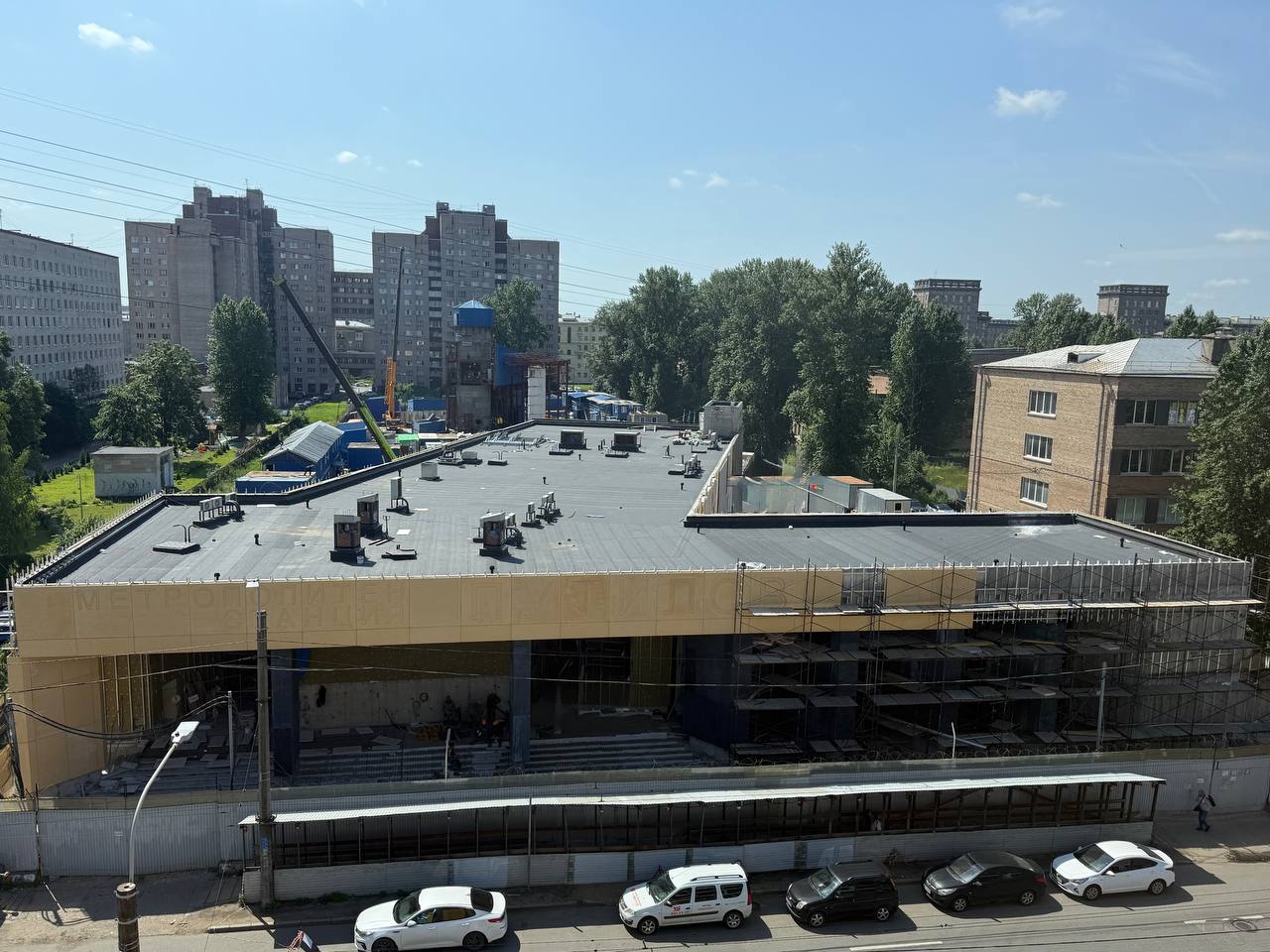 На строительстве вестибюля станции «Путиловская» Красносельско-Калининской линии Петербургского метрополитена приступили к укладке гранитных плит на лестницу перед входом.
