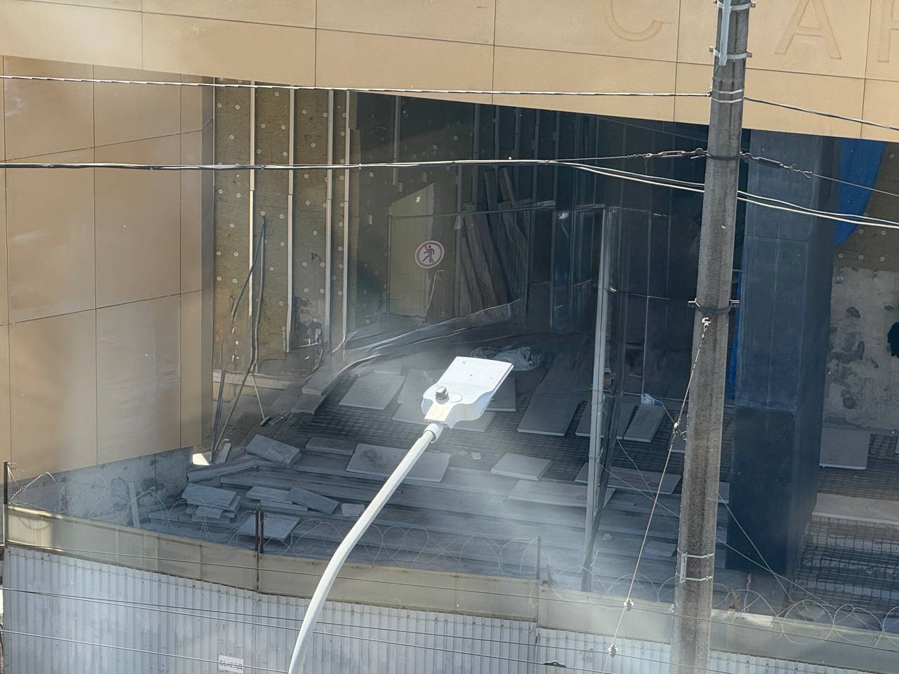 За проёмом, закрытым серым профнастилом, Кировский завод.