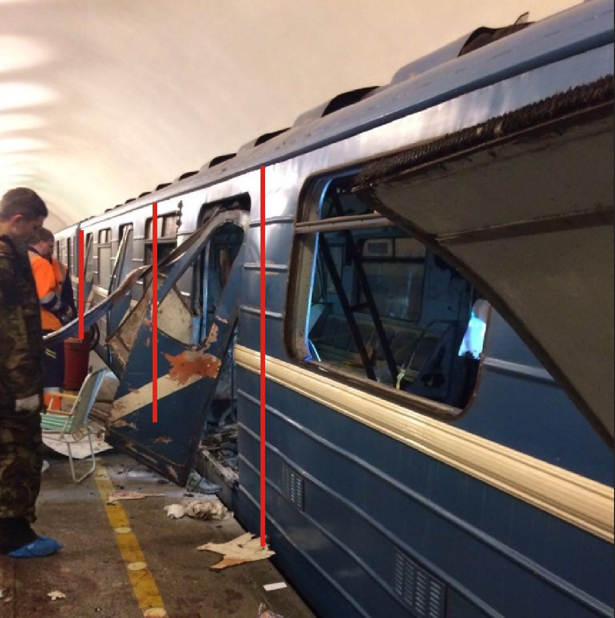 Кузов деформирован между первой и второй дверью. Первая дверь - справа вверху. Вторая - торчит. Поставил деления, где явно видно, что вагон раздуло в первой его части. Видимо эпицентр был там, где раздуло вагон.