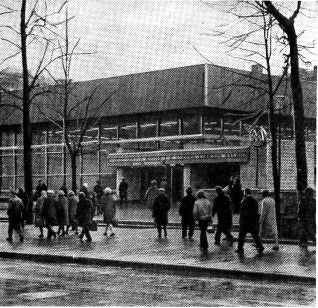 какая интересная здесь конструкция с буквой М. во-первых, буква М не над входной группой, а на отдельной палке. во-вторых, сама М тоже странная, да ещё и в круге. очень необычное решение для 1975 года.