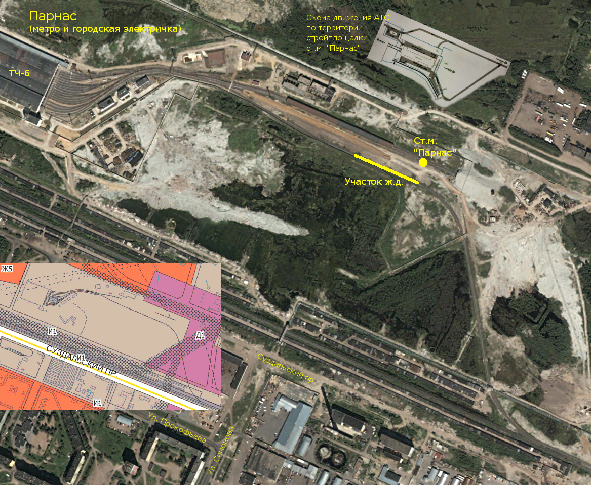 Хорошо, следующий большой вопрос. Как вы собираетесь сопрягать с наземными ст.м. - скажем, с Парнасом? Хорошо, положим, на восток из ТЧ идёт ж.д. полотно (которое придётся дорабатывать - и, кстати, оно над тоннелем метро, и причём - не самым благополучным). Как вы собираетесь вести ветку на запад (к Выборгскому шоссу)? Наперекрёст с путями метрополитена?! Или с юга от ТЧ?