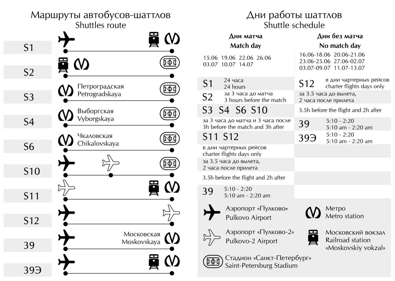 Трамваи-шаттлы №48 и 48а ходят от станции метро «Черная речка» до станции метро «Беговая», №19 – от станции «Старая Деревня», в дни матча проезд на них бесплатный. Чтобы проехать в метро бесплатно в дни мачта, надо пройти через первый турникет, предъявив билет и fan-id. Для бесплатного проезда в электричке достаточно предъявить fan-id и билет на матч контролеру в вагоне или получить билет в кассе на вокзале.