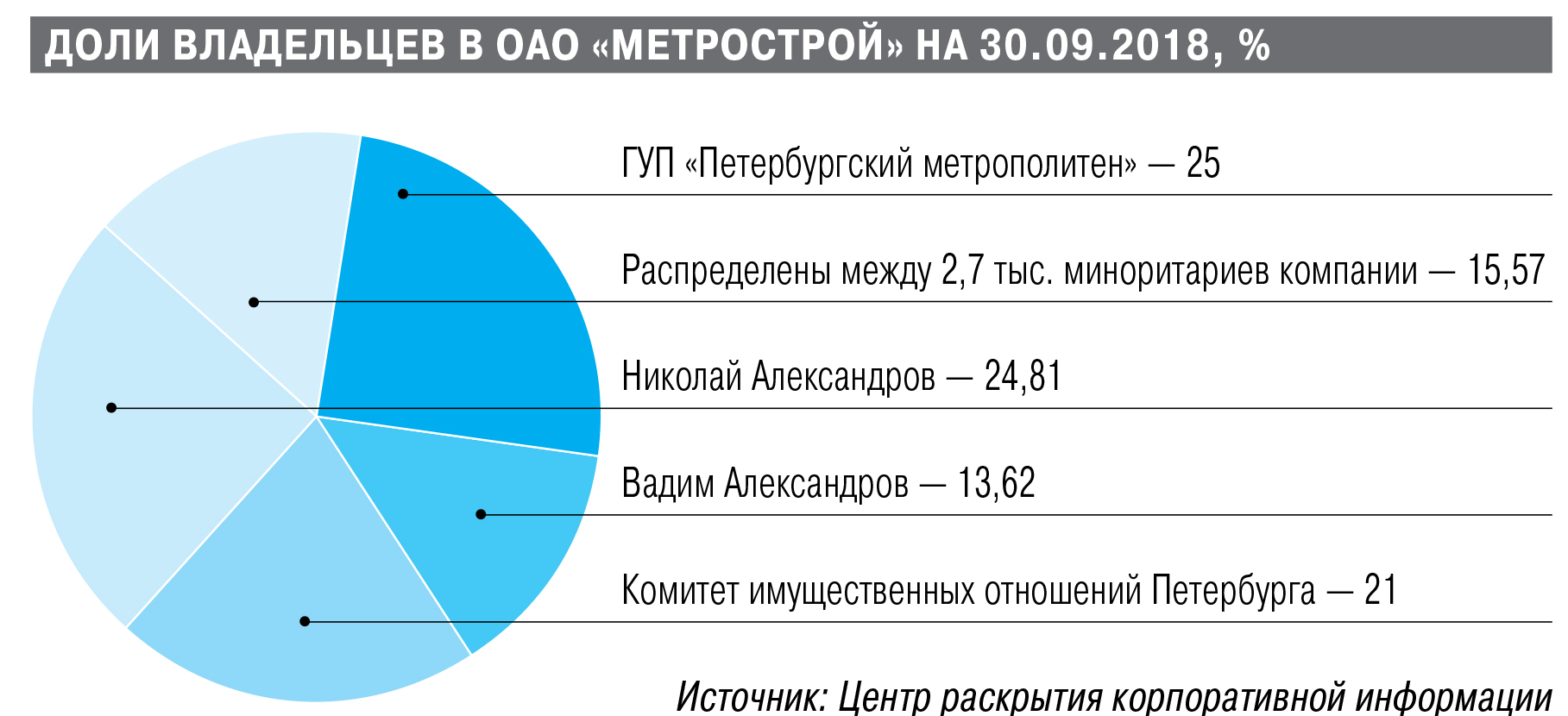 Как стало известно "Ъ", ОАО «Метрострой», подрядчик строительства стадиона «Санкт-Петербург» и станций метро «Беговая», «Новокрестовская» и Фрунзенского радиуса, может быть докапитализировано на 1,5 млрд рублей из городской казны. Таким образом, Смольный рассматривает возможность доведения доли города в компании до 100%. При этом вторым вариантом рассматривается сохранение миноритарного пакета у действующего держателя 24,81% акций генерального директора компании — Николая Александрова. Аналитики уверены, что переход компании под контроль города был неизбежным, и рассчитывают, что операционные показатели «Метростроя» вырастут.