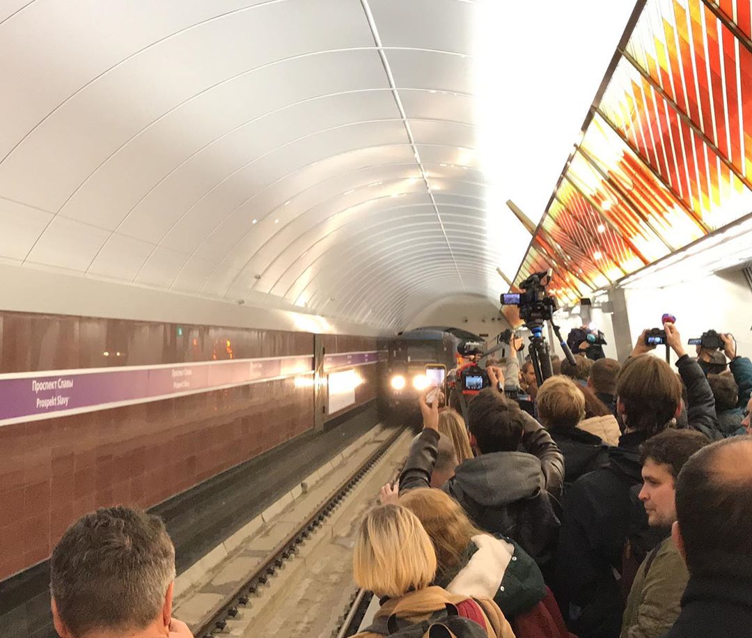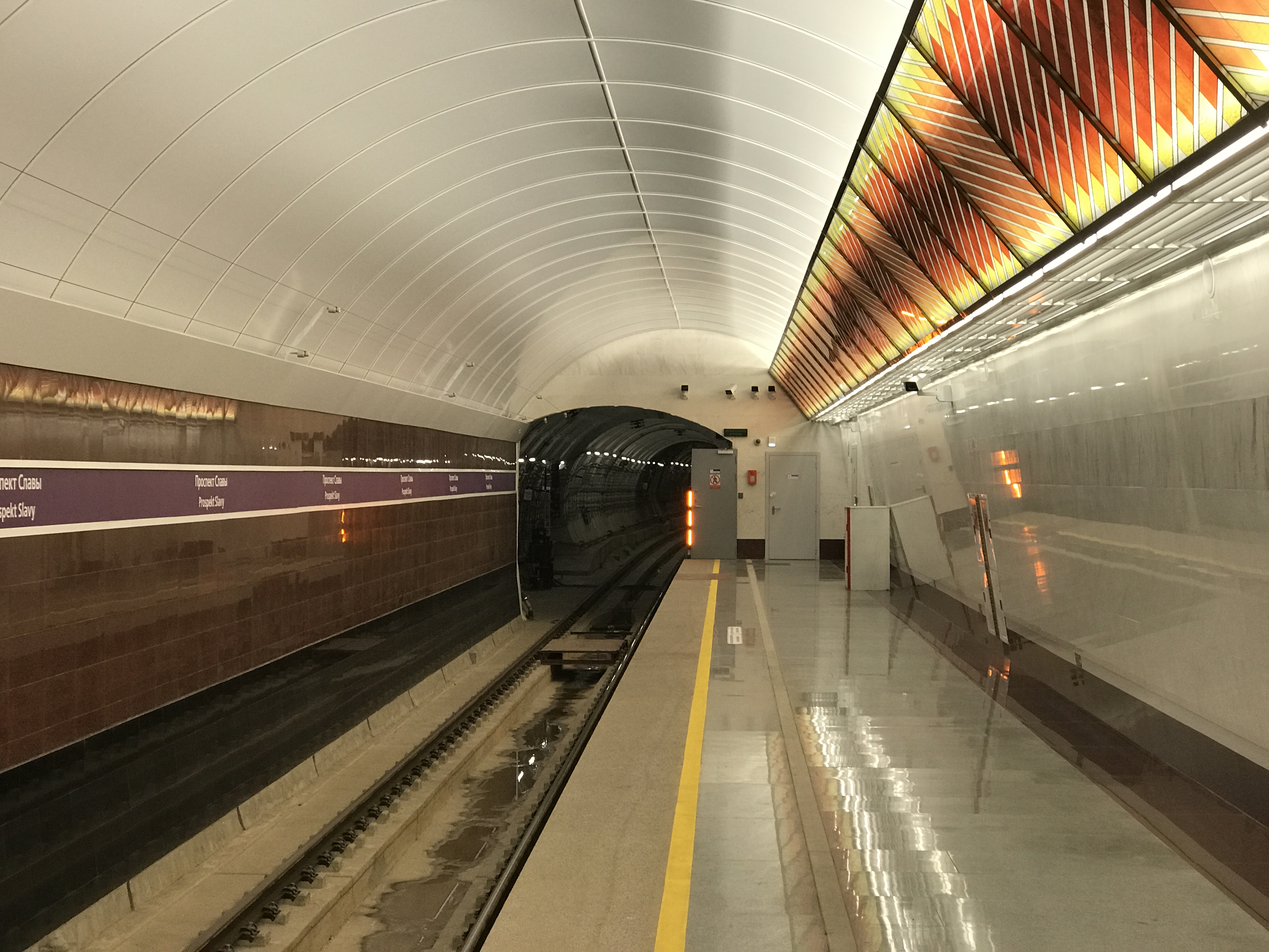 Что бы там ни говорили, а внутреннее убранство Проспекта Славы создает позитивное впечатление, вероятно за счет добавления в красно-белую гамму теплых желтых и оранжевых цветов. То есть авторы наверное хотели вложить военно-патриотический пафос, а получилось весьма мило и жизнерадостно.