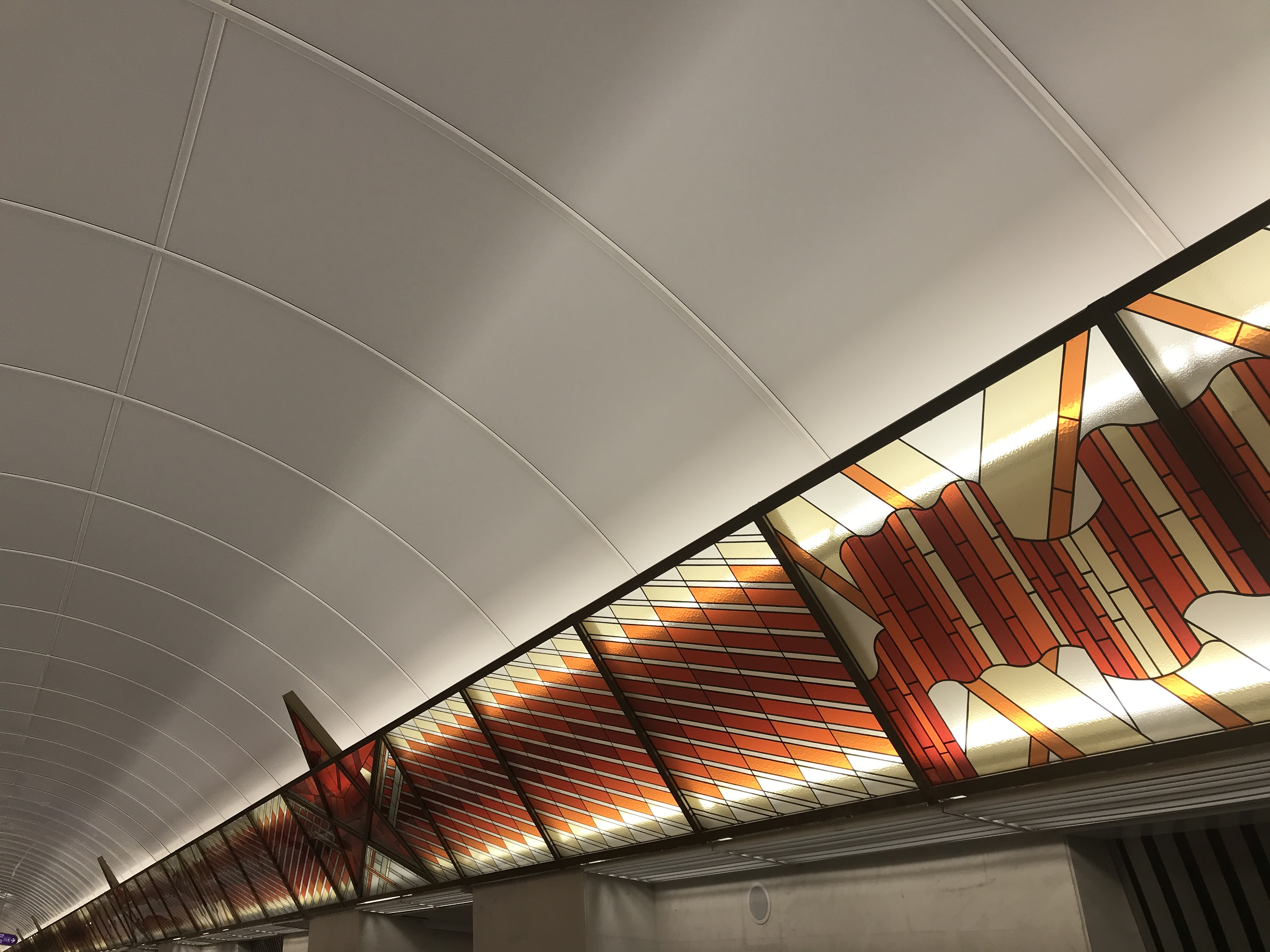 Однозначный победитель для меня. Уж насколько я не люблю пилонники, но эта станция прекрасна в оформлении. Одновременно просто и интересно. Белый камень, металлические рёбра у сидений в центральном и боковых залах. А витражи-светильники? Конфетка просто!