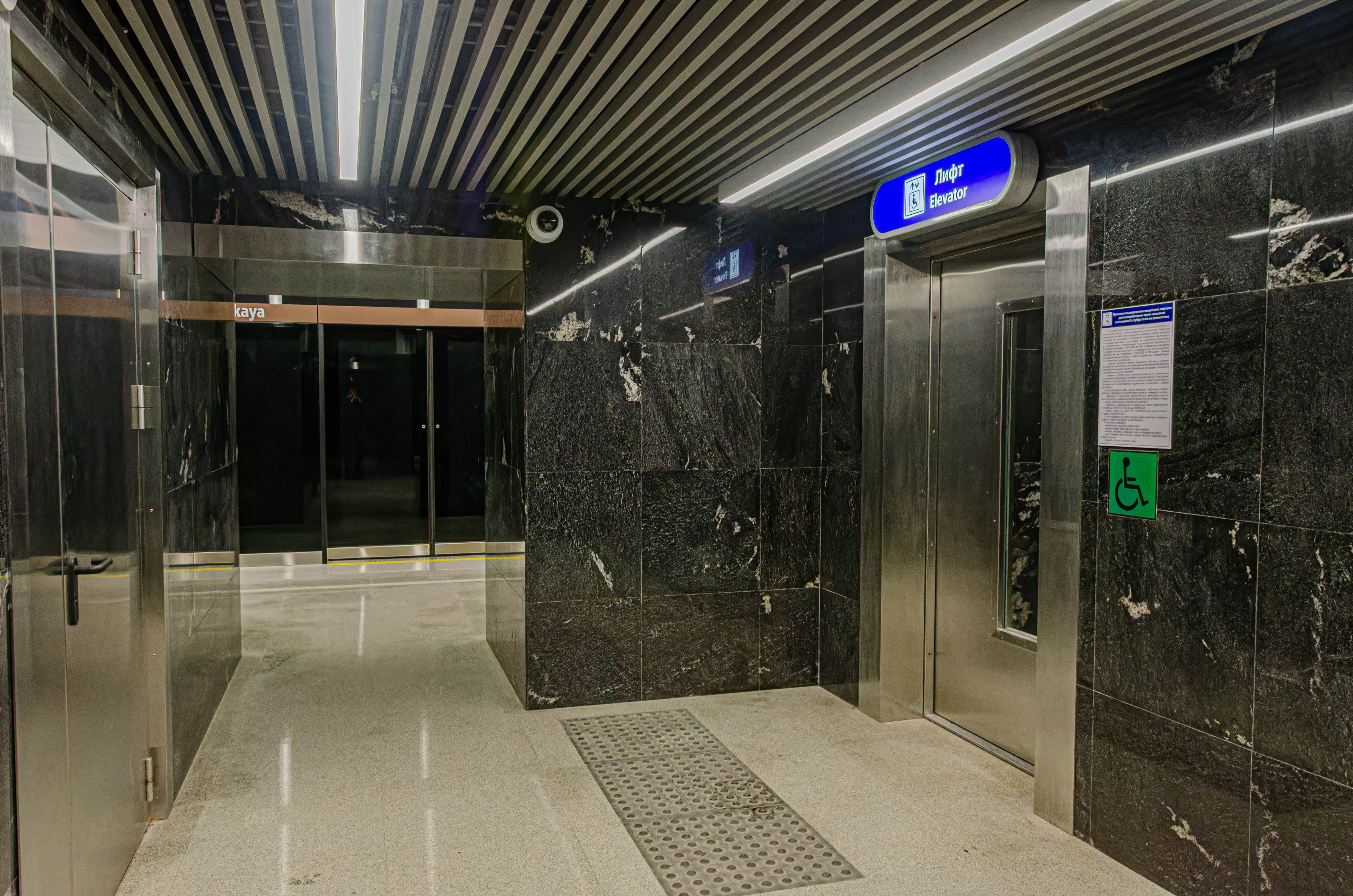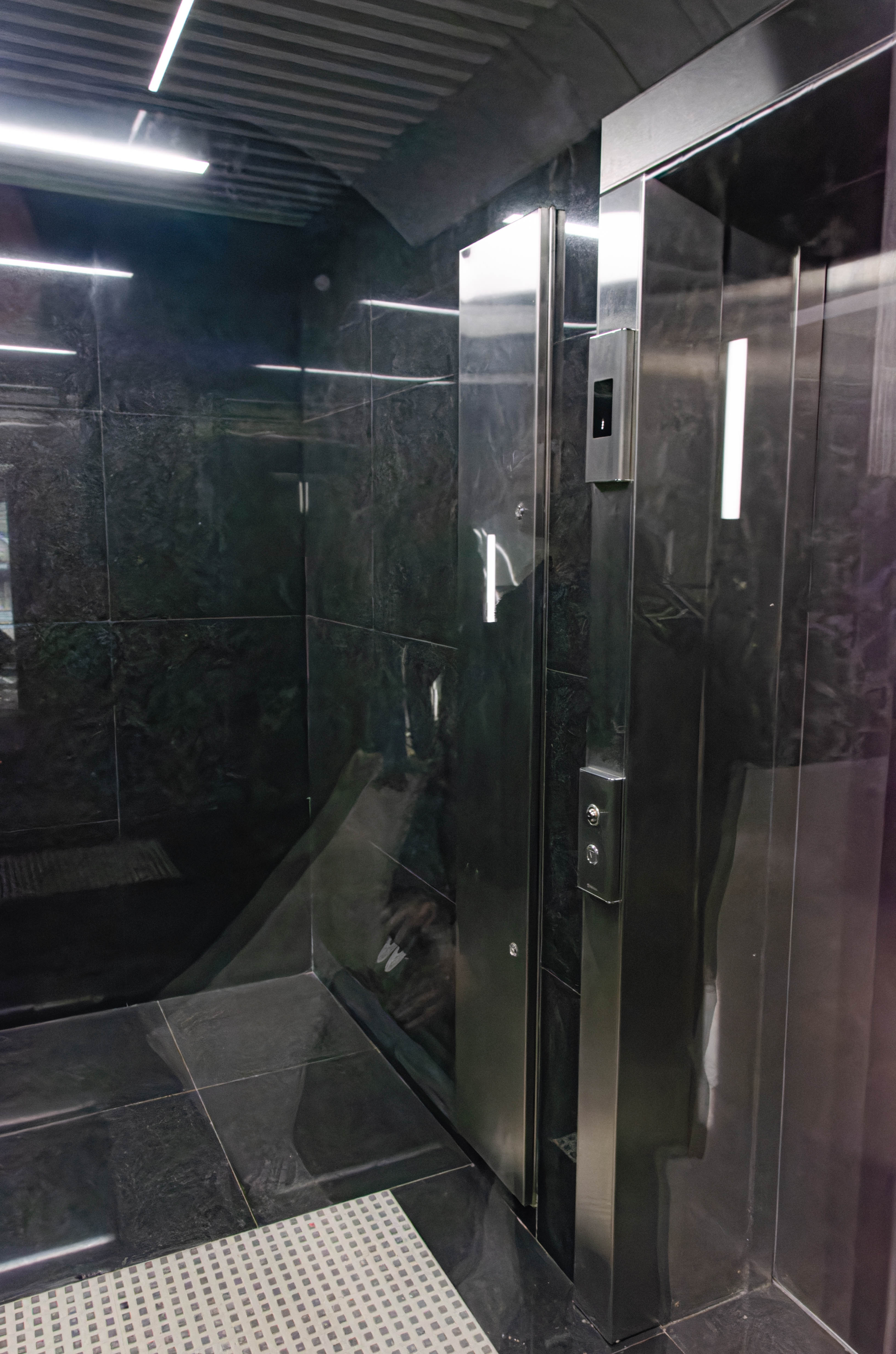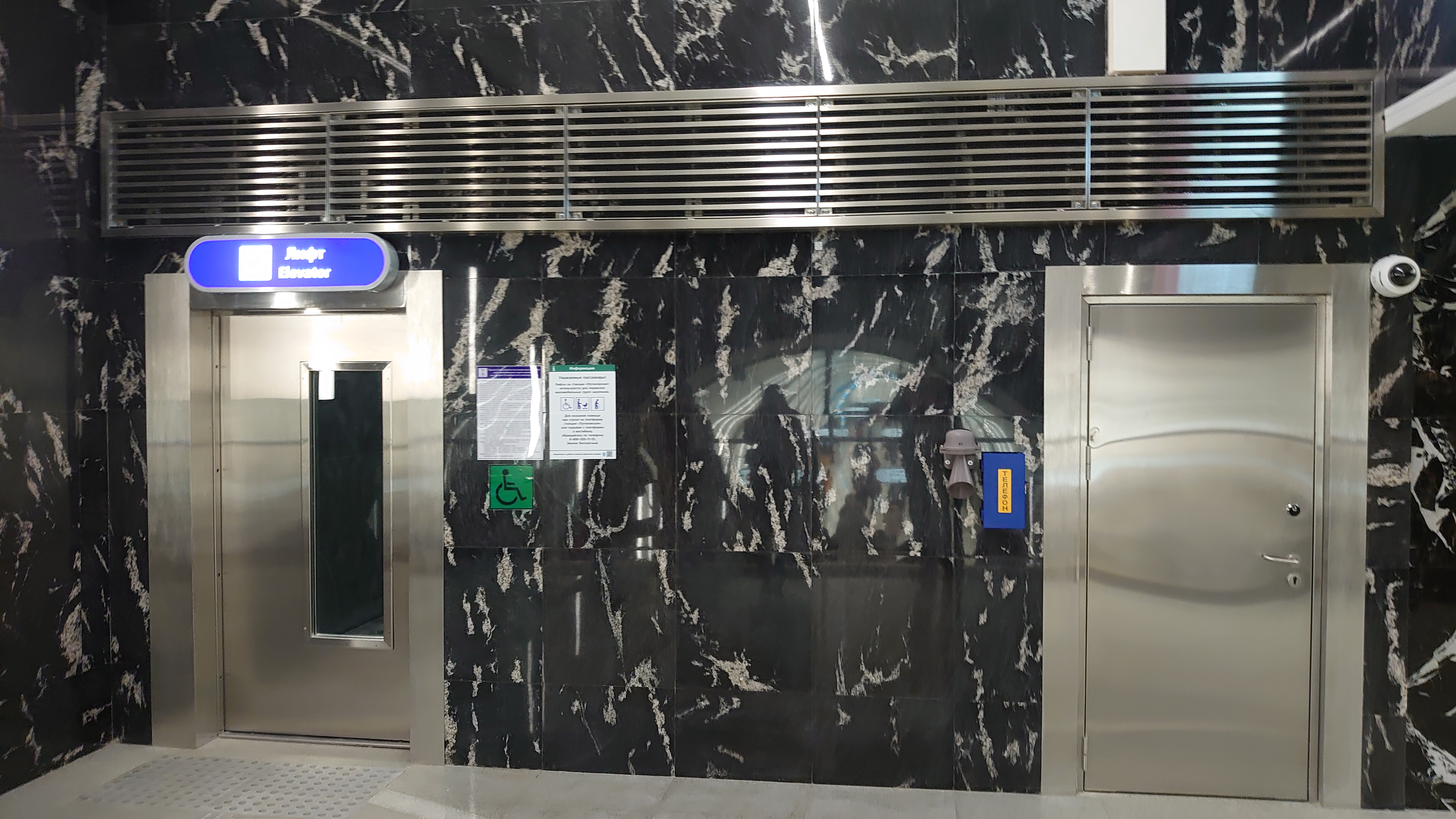 Тут в целом ничего необычного, этот лифт, ведущий со станции на пересадочный узел. В торце станции есть оба входа в этакое помещение, в котором находится дверь уже в другое помещение, в котором находится непосредственно сам лифт.