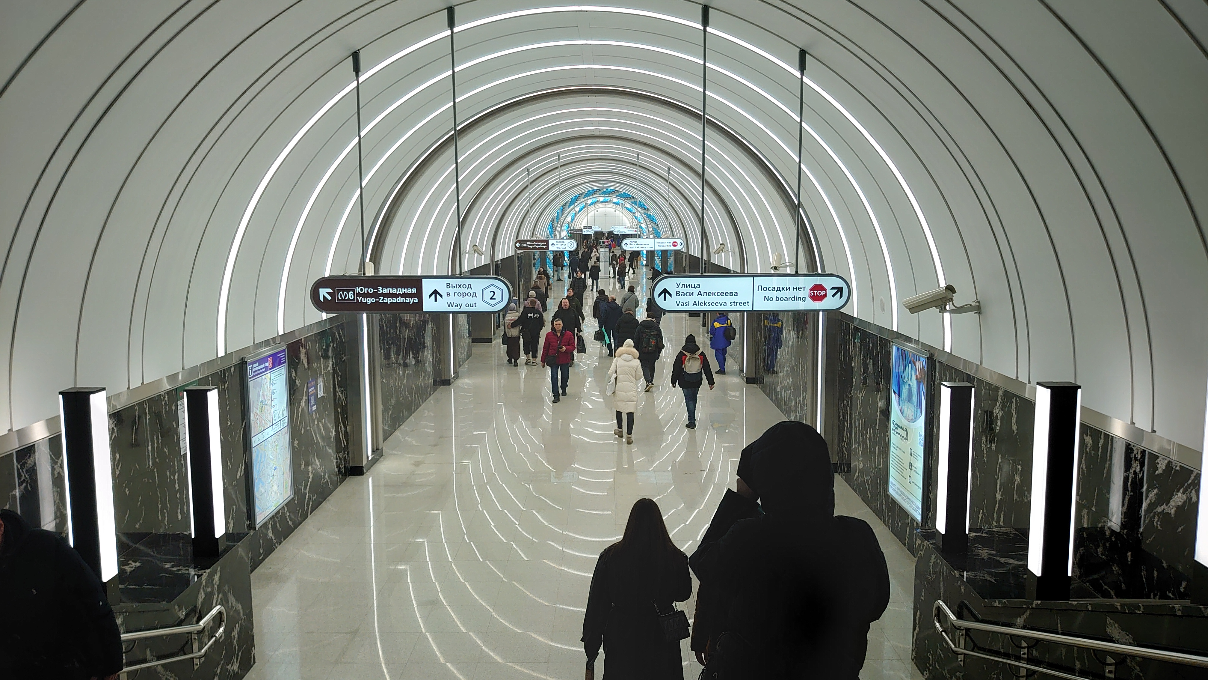 Очень красивая станция получилась. Совсем не темная, как опасались. А вот на Юго-Западной из-за защитных дверей не видно интервальных часов.