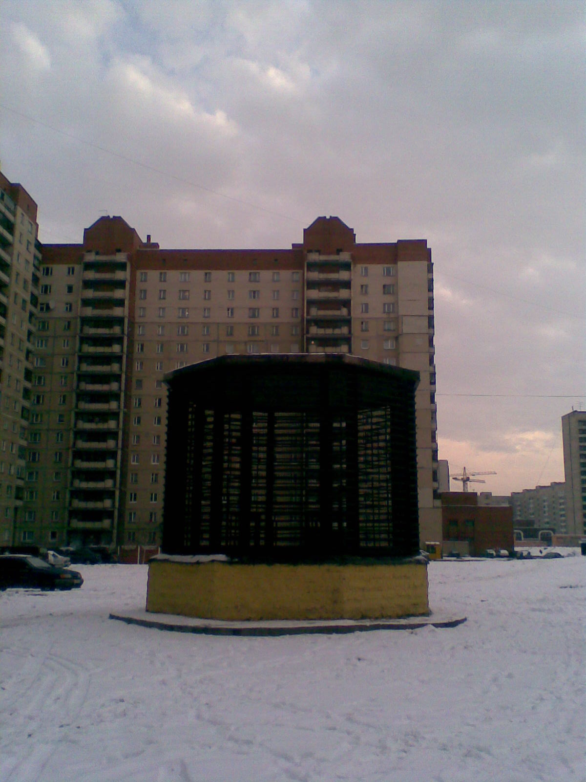 Я, конечно, понимаю всеобщее недоумение. Ремонт киоска выполнялся уже довольно давно. Раньше он был типовой для этой очереди (см. П.П.- Т.И.). Но дело даже не в изменении архитектуры, а в исполнении. На подобных киосках цоколь облицован камнем. А здесь не удосужились даже оштукатурить! А покрасили в жёлтый цвет (ну, почти Росси)