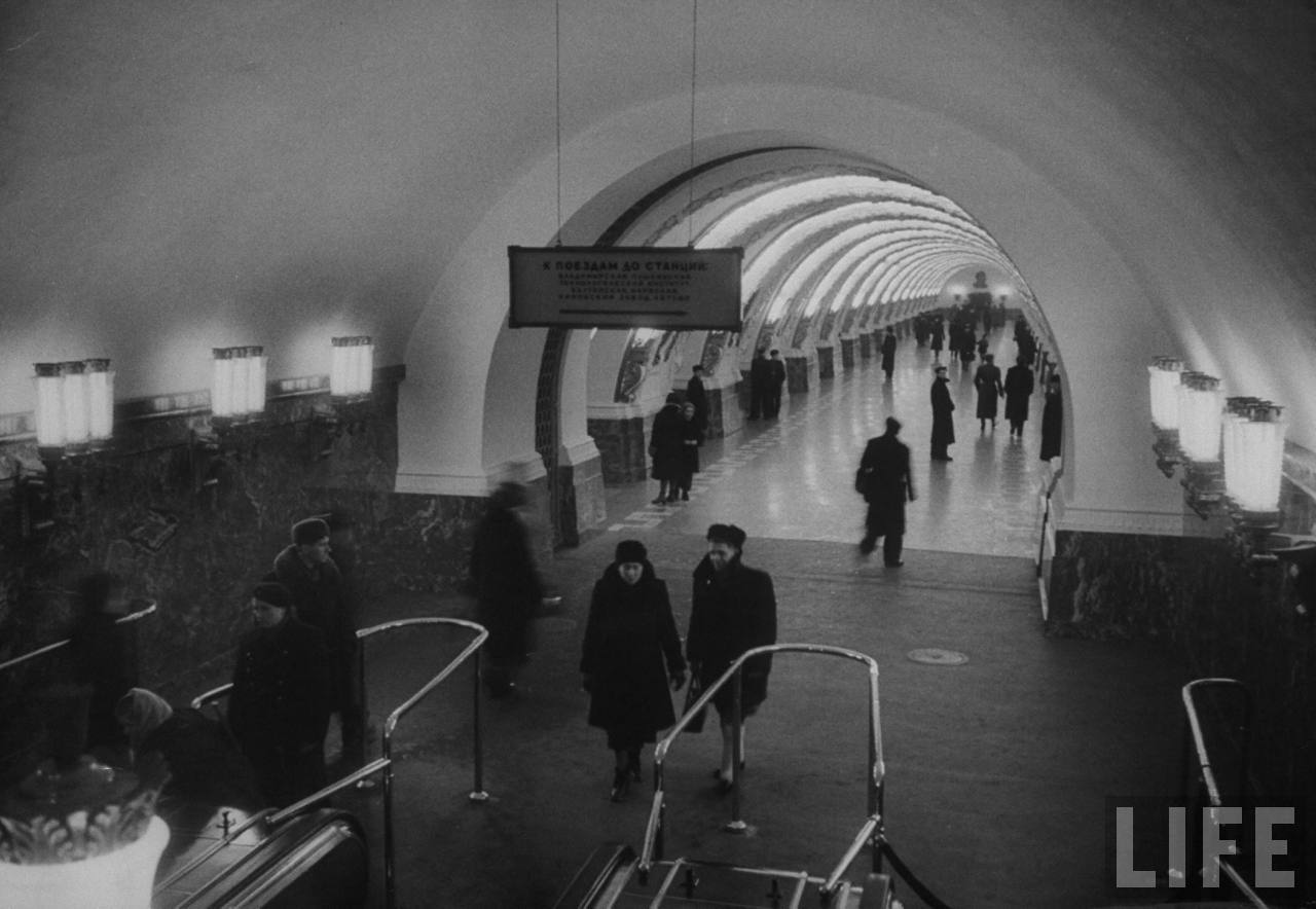 to darkglare: Я не думаю, что это постановочная съемка, слишком уж естественно ведут себя люди. Особенно это видно на последнем снимке в Автово - появление иностранца-фотографа с крутой аппаратурой явно было неожиданным для этих двух мужчин по краям кадра... Ну а военных всегда было много, посмотрите любые фотографии города и метро 50-70-х, а то и 80-х годов - редко в каком кадре вы не увидите людей в форме. Ну а с датой либо LIFE перепутал, либо на "Пушкинскую" народ пускали просто полюбоваться станцией, проблемы там были только с наклонным ходом.