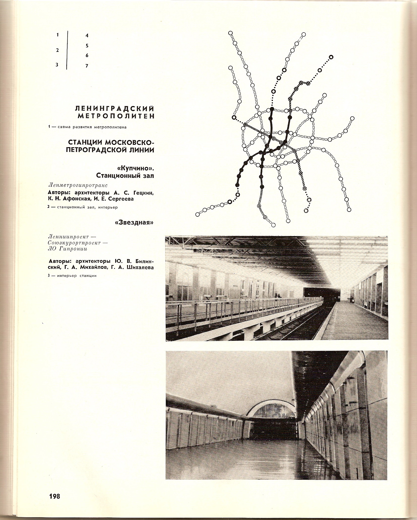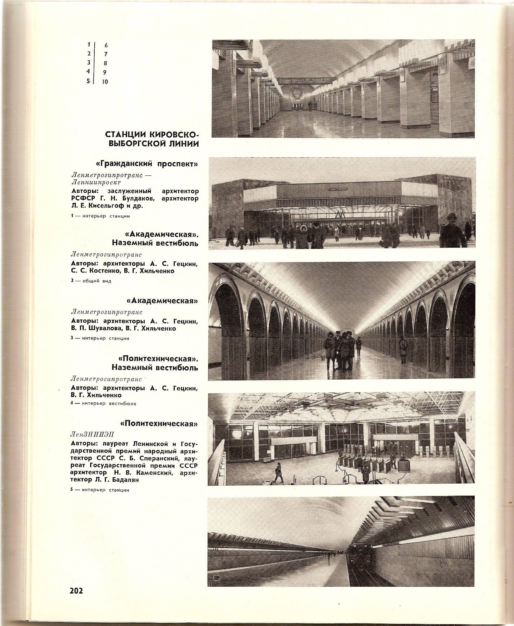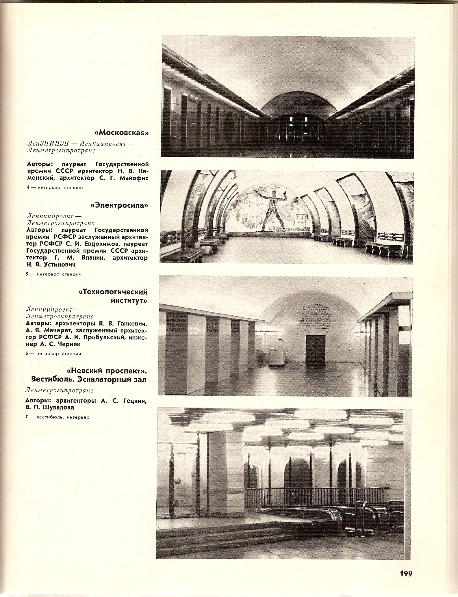 И ещё старые фотографии из старой книги ("Творчество ленинградских архитекторов", 1979г, Л.: Стройиздат, Ленинградское отделение). Книга посвящена зданиям и проектам в функциональном (интернациональном) стиле, так что станций первой очереди тут нет. Но и без них тут много интересного:
