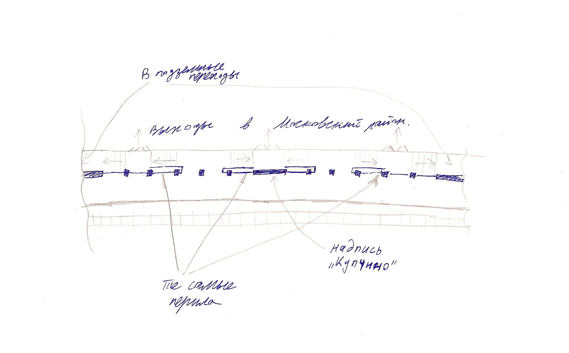 За стенкой, которая посередине - площадка на уровне земли, с неё сразу выход в московский район. Несколько лет назад этот спуск ликвидировали и сделали пол на уровне с платформой. К этой площадке ведут небольшие лестницы от платформы они огорожены этими самыми перилами (то, что Вы обвели вторым и третьим кружком). То, что вы обвели крайними кружками - это ограждение спусков в подземные переходы. Часть этих ограждений осталась, часть убрали и сделали помосты для ларьков.