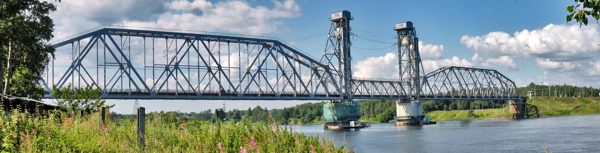 Мост через Неву - Кузьминский. Разводной, центральный пролёт поднимается по направляющим, расположенным на "башнях", оставаясь в горизонтальном положении.