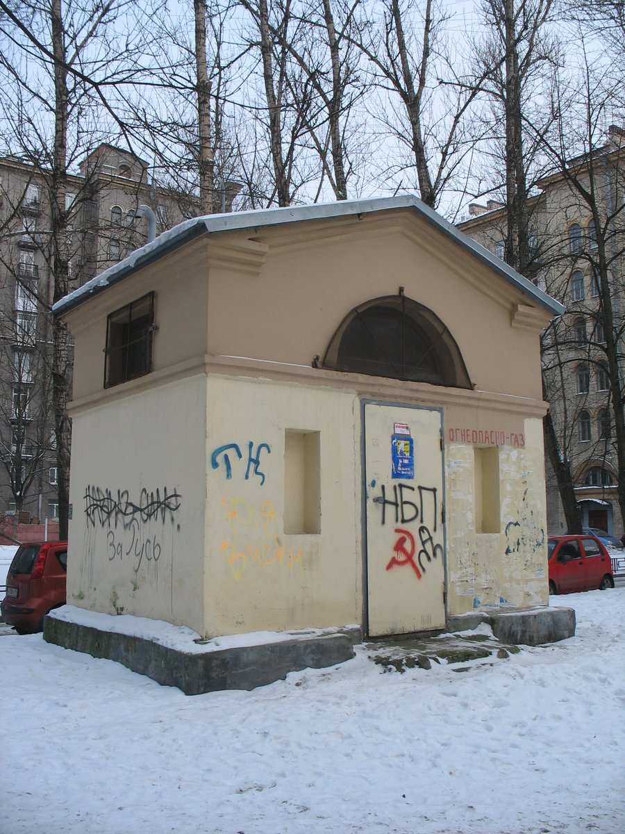 Рис 8. ГРП №73. Неоштукатуренная будка 1-го поколения с нишами по периметру. Квартал 11 Малая Охта. Ул. Стахановцев.