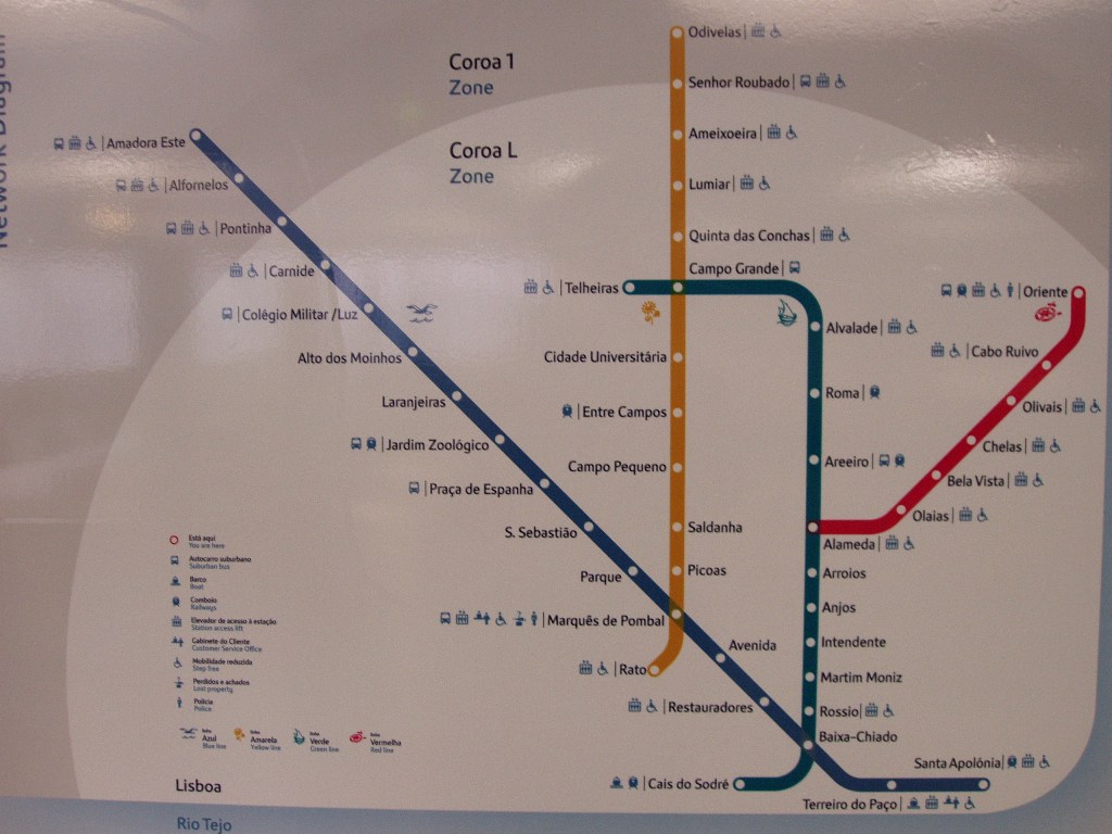 Метро Lisboa работает с 6:30 до 1:00 с минимальным интервалом 4 минуты на линии Girassol и 3 минуты на линии Gaivota в течение часов пик. Определенные входы на станцию закрываются в 21:30.
